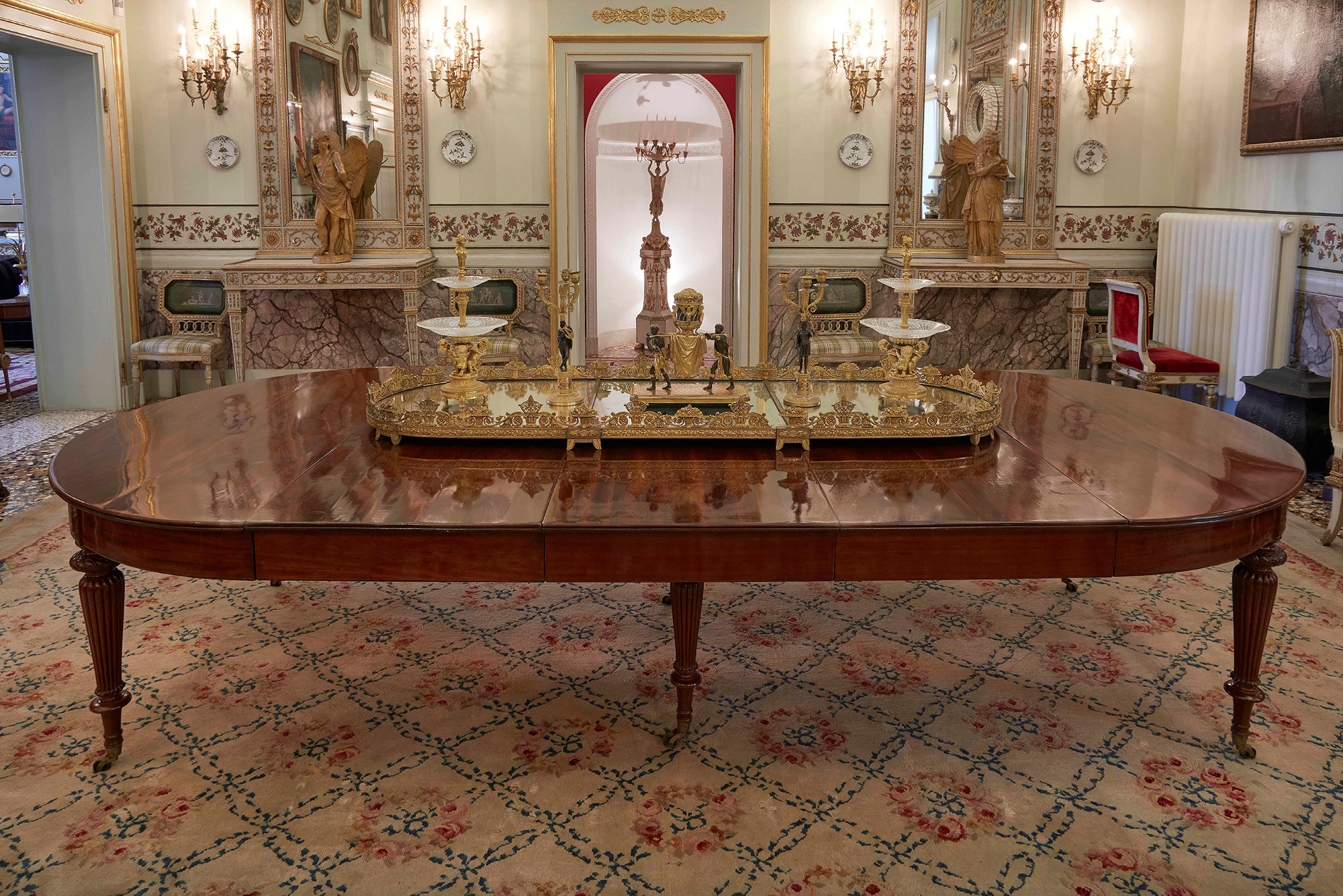 Tavolo da pranzo in legno di mogano. Inghilterra XIX secolo Sei gambe scanalate e rastremate munite di rotelle, altezza cm 79, diametro cm 164, con allunghe tot cm 355, Manuel Longo, Milano