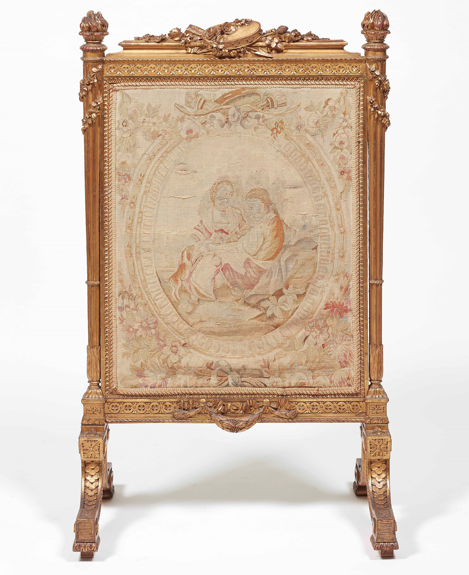 Parascintille in legno dorato e intagliato. XIX secolo Montante un arazzo con medaglione ovale di ghirlande fiorite e scena campestre, W. 61 - D. 40 - H. 107 cm