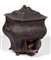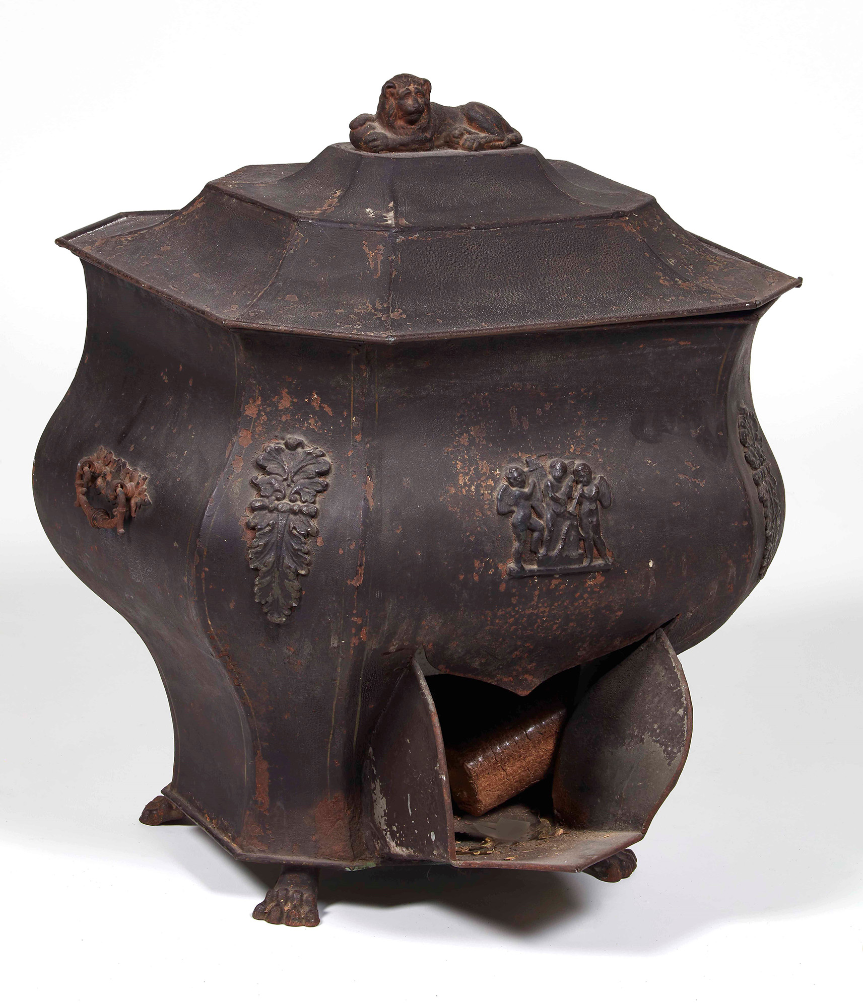 Porta legna in metallo. XX secolo Fregi di putti applicati sul fronte e coperchio sormontato da leone. Piedi ferini, W. 53 - D. 41 - H. 82 cm
