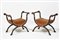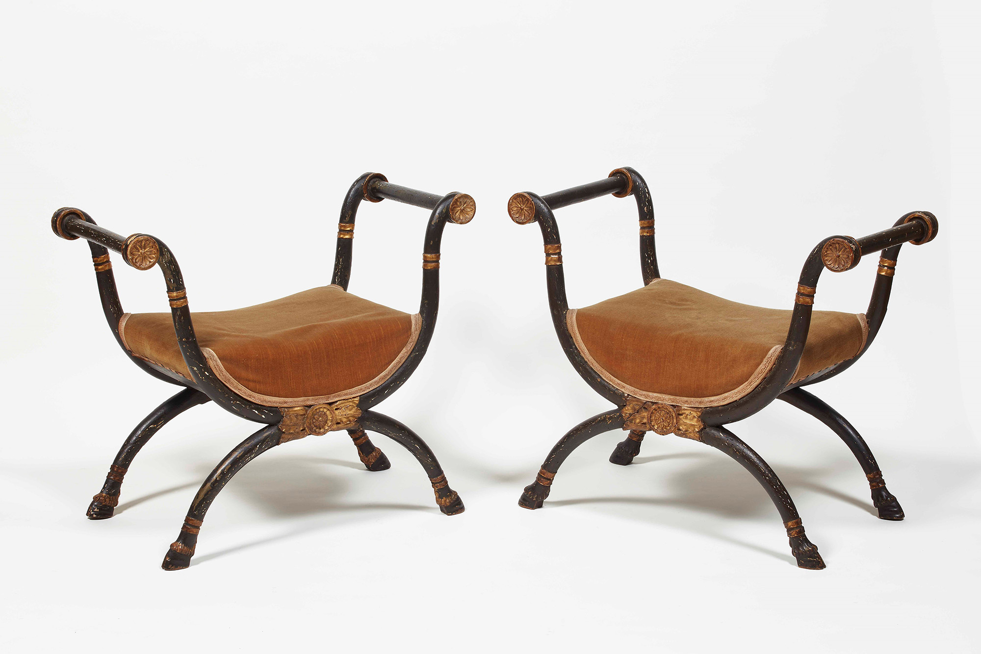 Coppia di sgabelli in noce scolpito, intagliato, ebanizzato e dorato. Firenze inizio XIX secolo Montanti arcuati terminanti con piede caprino, cm 79x44x70, E. Colle, I mobili di palazzo Pitti. Il secondo periodo lorenese 1800-1846. Il Granducato di Toscana: Volume 1. Firenze-Torino, Centro Di, 2000, p. 241., Esemplari simili sono conservati tra gli arredi di Palazzo Pitti a Firenze.