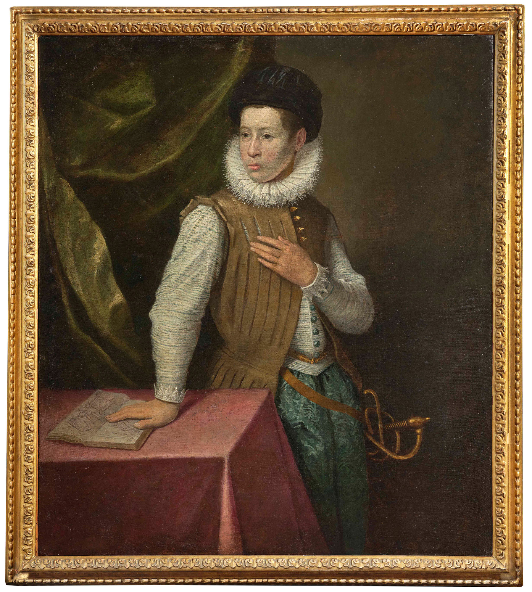Giovanni Antonio Fasolo (1530 ?-1572 Vicenza), Ritratto di giovane gentiluomo con spada in cornice dorata, olio su tela, W. 105 - H. 120 cm, Dott. Marco Tanzi, "(...) Il notevole ritratto evidenzia a tutta prima i caratteri della scuola pittorica di Verona nel terzo quarto del Cinquecento per il diretto ascendente delle opere dei principali maestri attivi nella città scaligera, da Domenico Brusasorci a Paolo Veronese: volendo mettere a fuoco con maggiore precisione il riferimento attributivo, il nome corretto è quello di Giovanni Antonio Fasolo., Sono poche le testimonianze che si possiedono sulla vita dell'artista che, dopo Giovanni Battista Zelotti, di poco più anziano, è 'il più notevole tra i collaterali del Veronese'. La sua figura è principalmente ricordata per gli affreschi di Villa Da Porto-Colleaoni a Thiene, dove, all'inizio degli anni Cinquanta, proprio insieme allo Zelotti, prende parte alla decorazione del Camerone del camino. (...)"