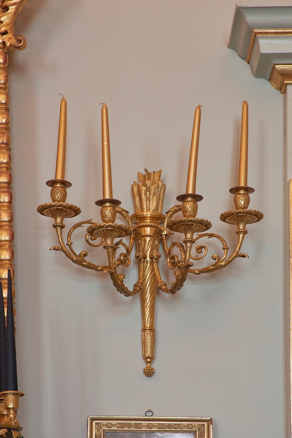 Coppia di grandi appliques in bronzo dorato al mercurio e cesellato. Francia inizio XIX secolo Stampigliate DD. 599. Fusto a faretra da cui si dipartono quattro braccia terminanti a testa di aquila. Per il loro stile sono attribuibili a Gouthière (1732 - 1813), altezza cm 54, larghezza cm 50, Antichità Maurizio Nobile, Bologna