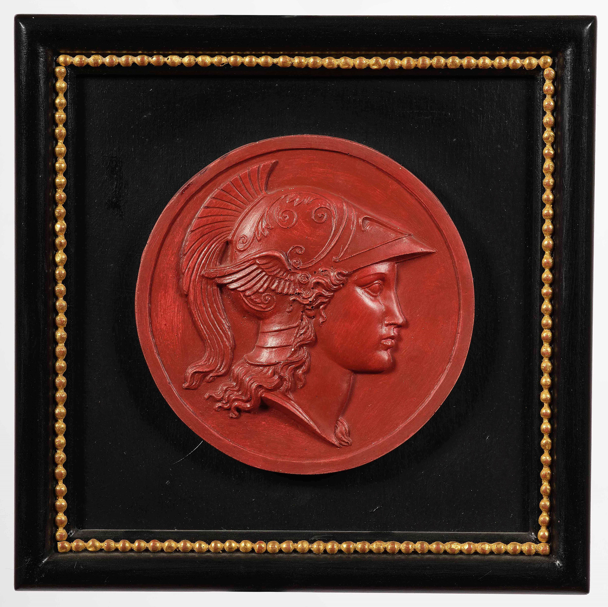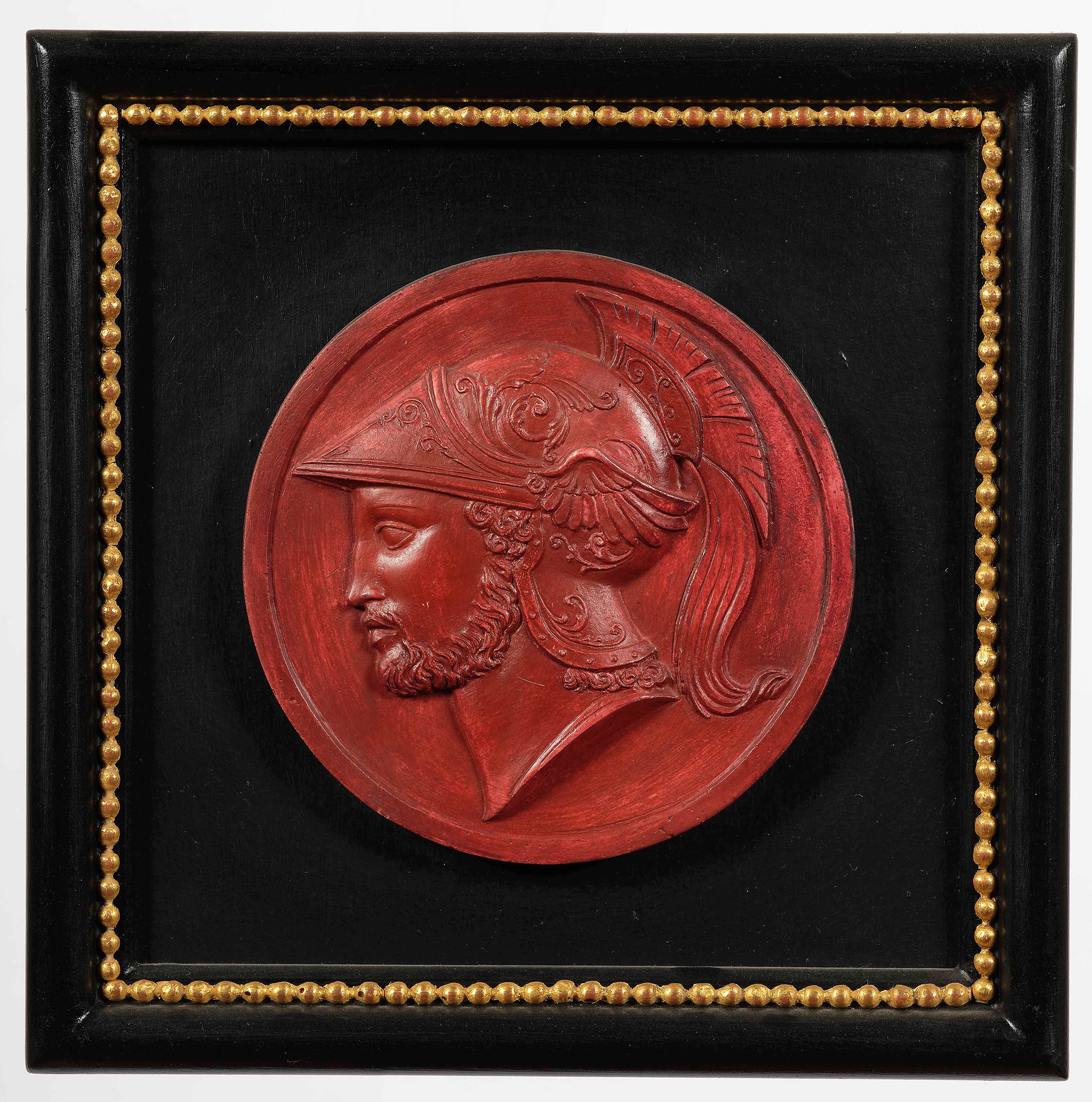 Coppia di medaglioni raffiguranti i profili di due giovani romani con elmo, XX secolo Terracotta (?). Diametro cm 14,5. Cornice in legno, cm 24,5 x 24,5. Conservazione: ottima