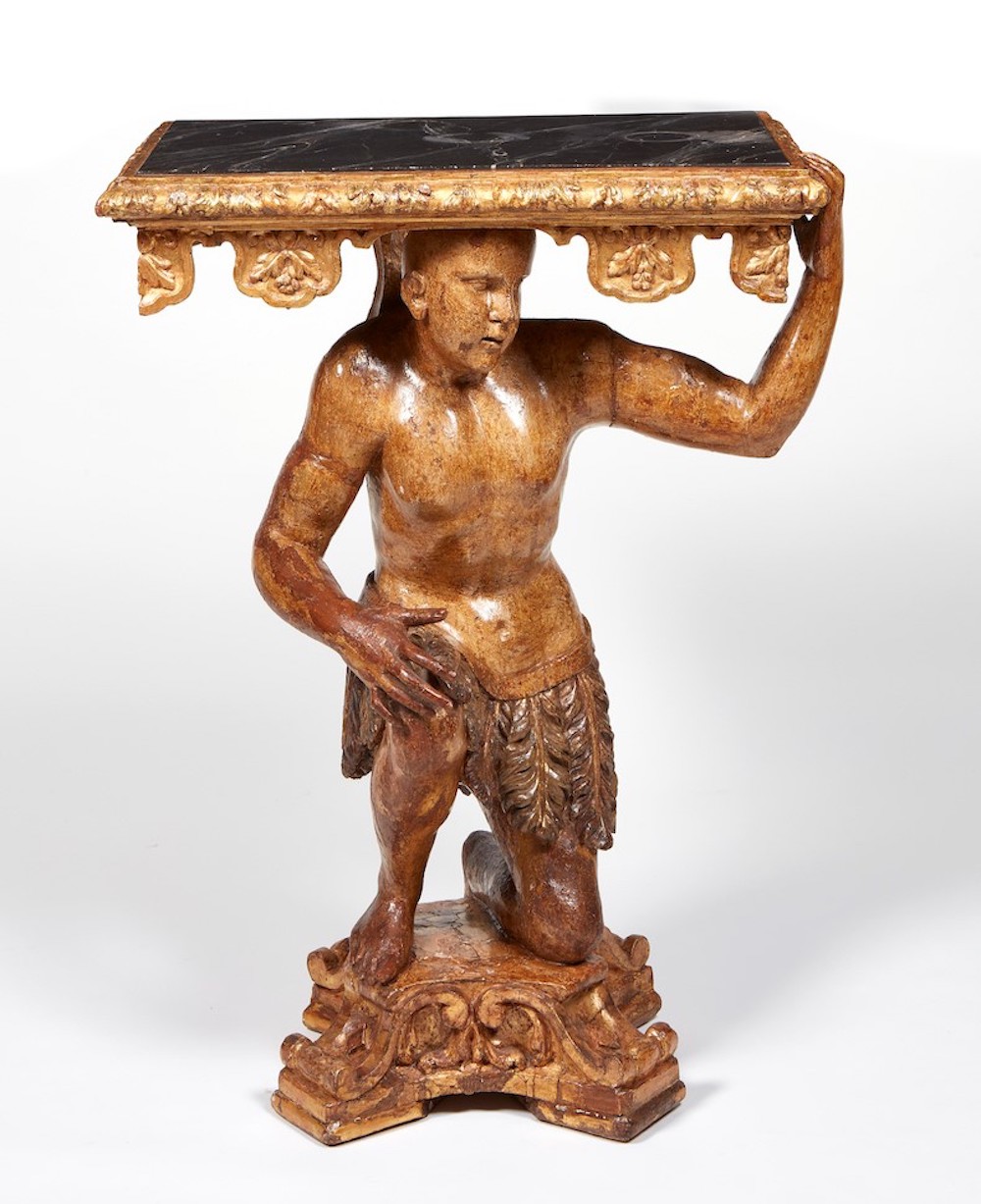 Gueridon in legno scolpito, laccato e dorato. Arte barocca del XVIII secolo, Venezia Sostegno a guisa di servo inginocchiato che regge un pianetto in legno laccato a finto marmo. Base tripode riccamente intagliata a volute, W. 67 - D. 52 - H. 92 cm, Claudio Michelotti Antichità, Parma