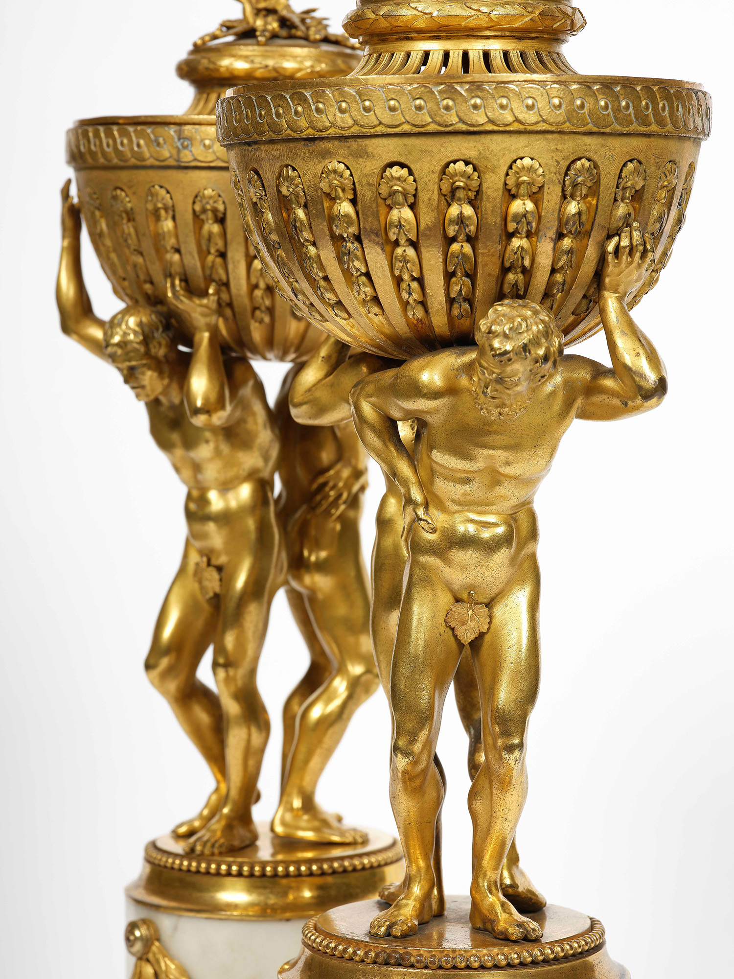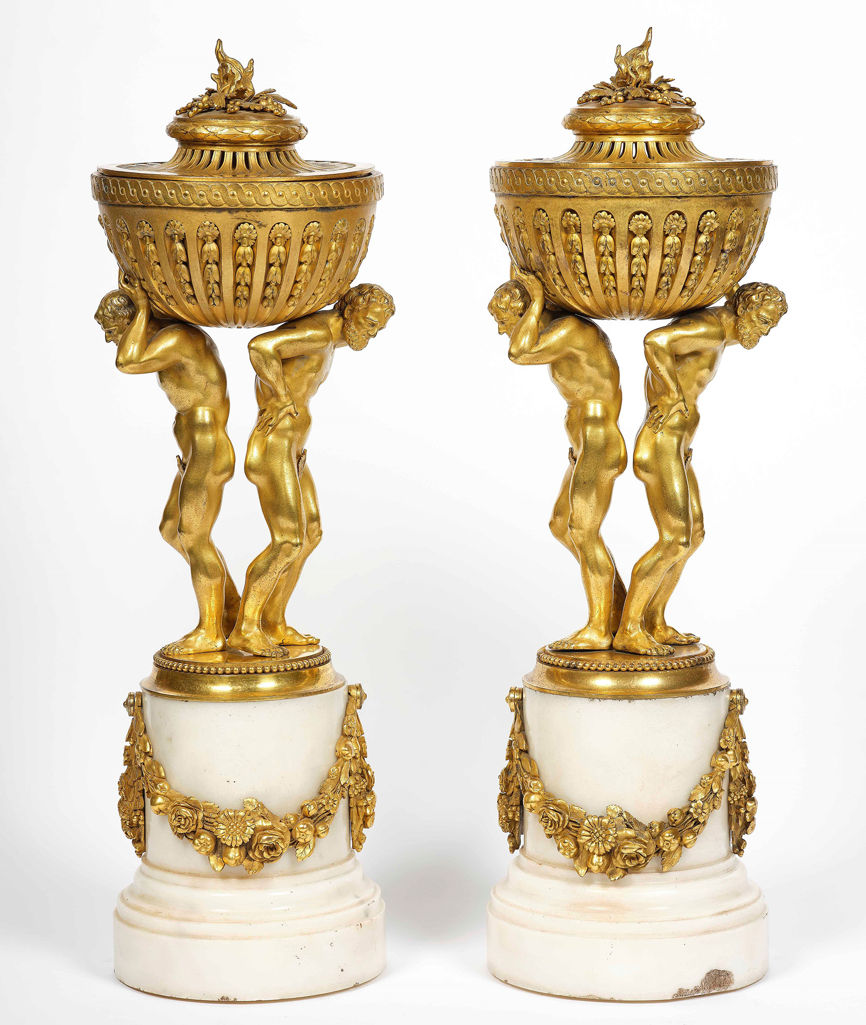 Coppia di brucia profumo in bronzo dorato e cesellato e marmo bianco. XIX secolo fusto centrale a guisa di coppia di Atlanti che sorreggono sulla schiena una coppa con coperchio, H. 48 cm, Antichità Maurizio Nobile, Bologna