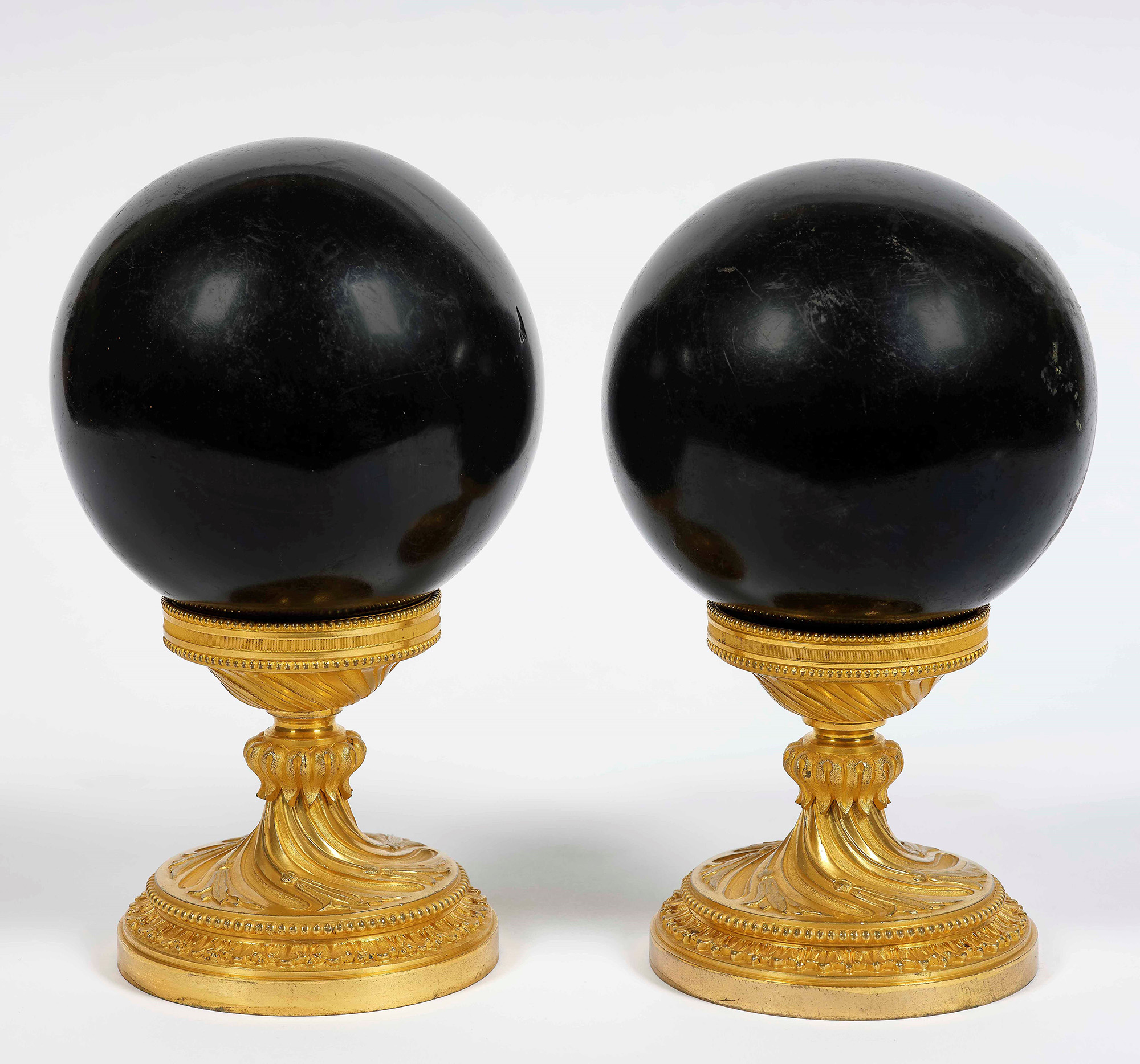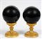 Coppia di basi in bronzo dorato e cesellato a torchon che reggono sfere in marmo H. 19 cm