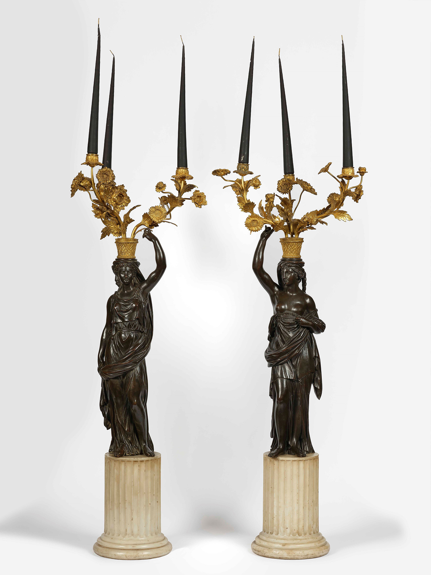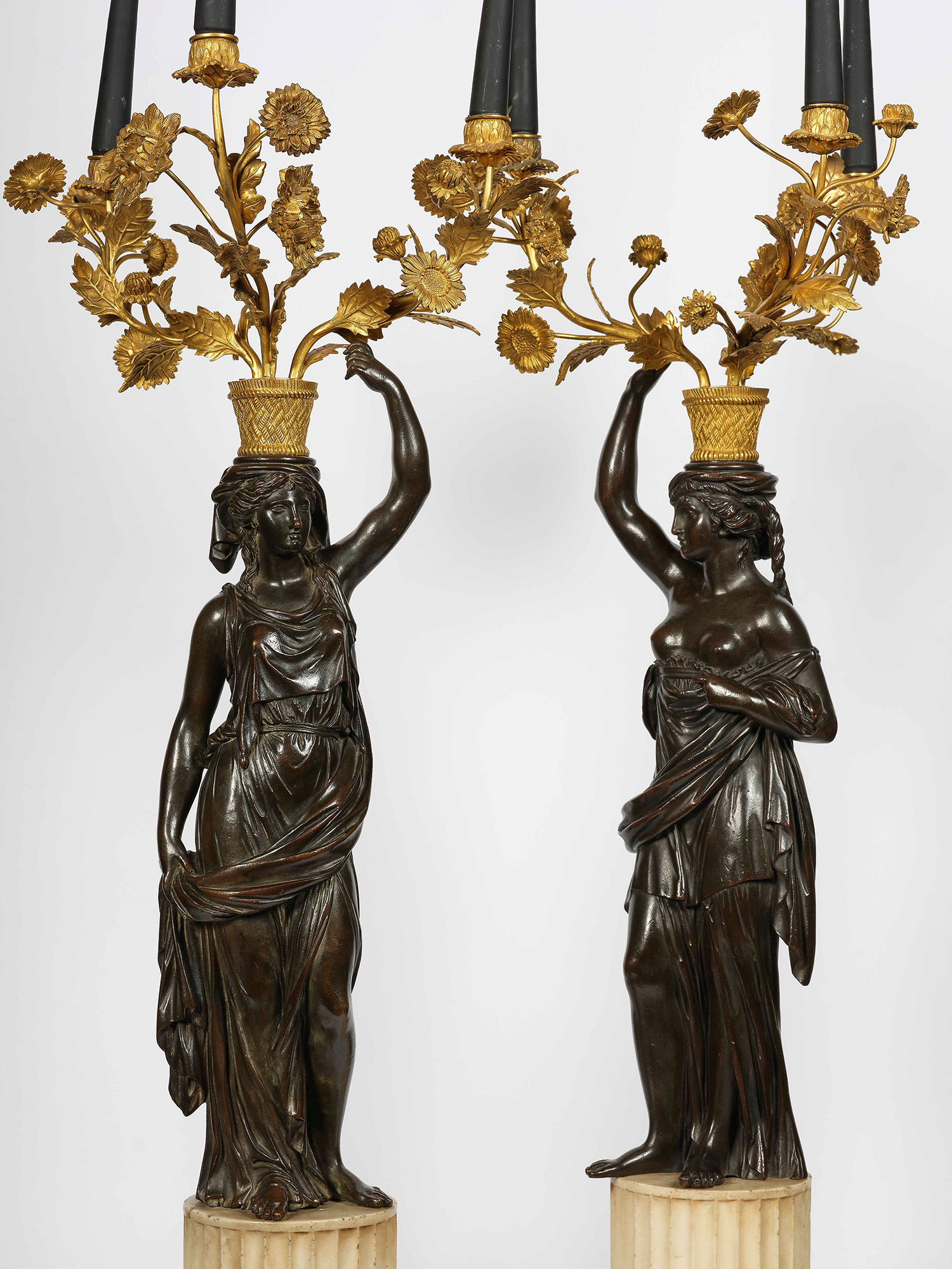 Coppia di candelabri in bronzo patinato e dorato. XIX secolo Fusto a vestali a tutto tondo che sorreggono un cesto con tre bracci in forma di steli fioriti, poggianti su base a semicolonna scanalata in marmo bianco, H. 96 cm