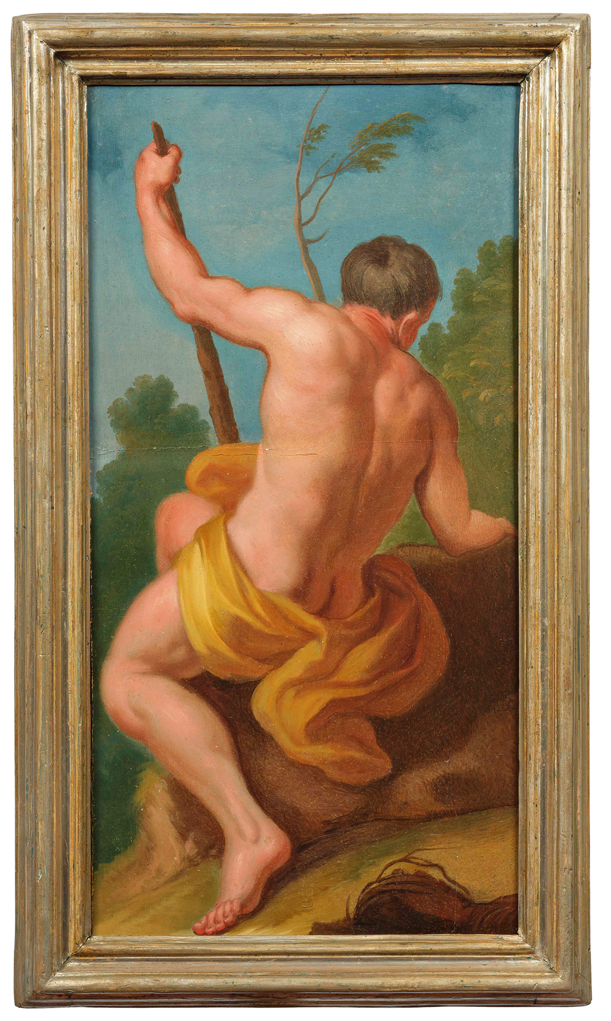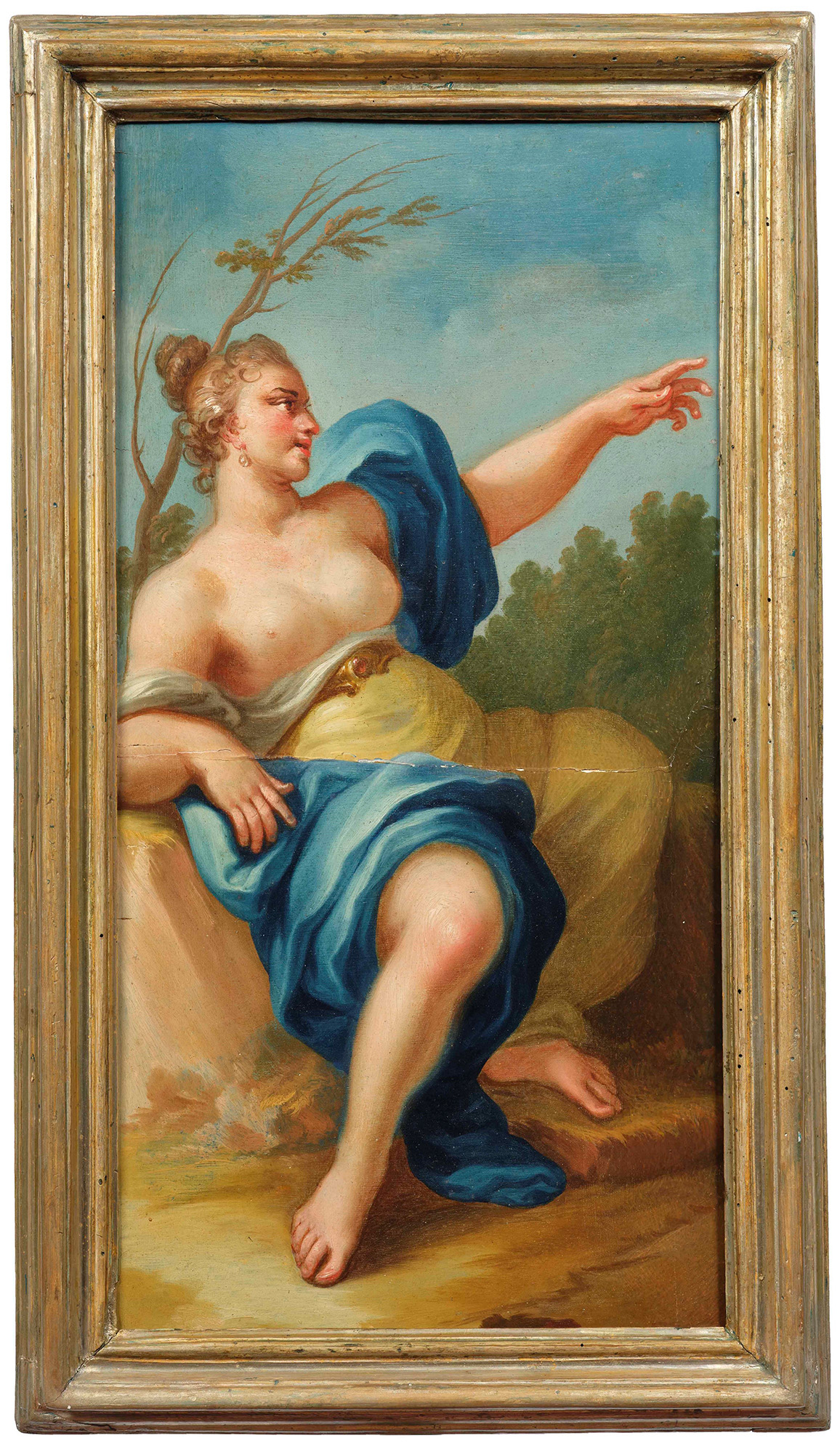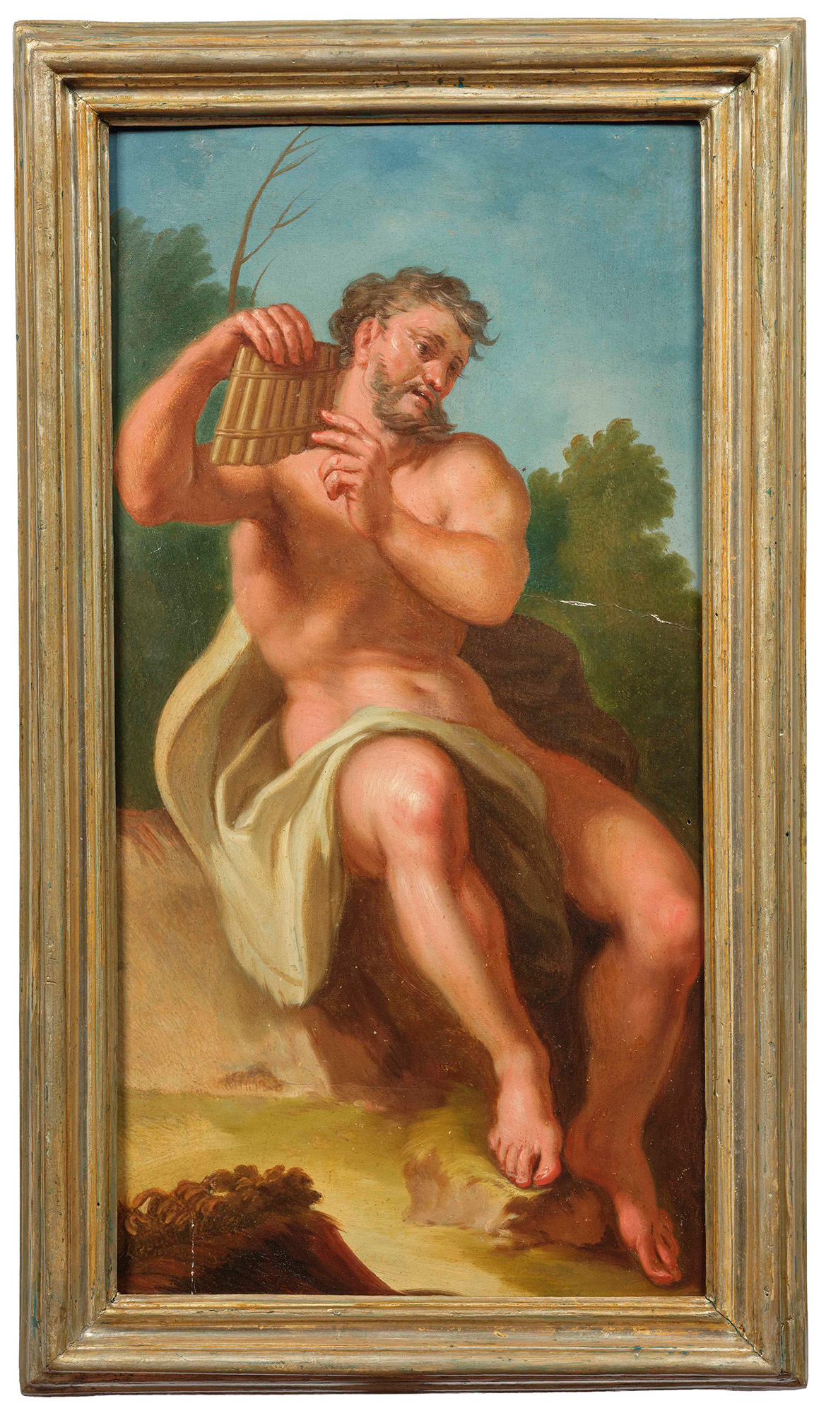 Venere (?), Diana, Marsia ed Ercole Scuola napoletana del XVIII secolo quattro dipinti, in cornici dorate, olio su tavoletta, W. 30 - H. 57 cm, Expertises con vecchie attribuzioni a Johann Carl Loth (Maurizio Marini) e a Pietro Antonio Novelli (Luigi Armondi, 1999), I personaggi raffigurati in queste quattro tavolette di soggetto allegorico risultano essere ben riconoscibili grazie ai loro tradizionali attributi e, con tutta probabilità, in origine dovevano far parte di un più ampio ciclo a tema mitologico-amoroso costituito da varie figure di divinità, ninfe ed eroi., Ercole, raffigurato di spalle, regge saldamente la clava, simbolo di forza. Il dio Pan, invece, viene ritratto nell'atto di suonare la siringa di canne mentre Diana tiene in mano il proprio arco e una freccia appena estratta dalla faretra che giace ai suoi piedi., Meno connotata negli attributi risulta essere la figura femminile, avvolta in una veste gialla e cinta da un drappo blu, raffigurata nell'atto di indicare verso un punto lontano. A causa della mancanza di elementi distintivi, la critica ha proposto varie ipotesi identificando questa figura femminile come Venere, Galatea, Giunone oppure Arianna.