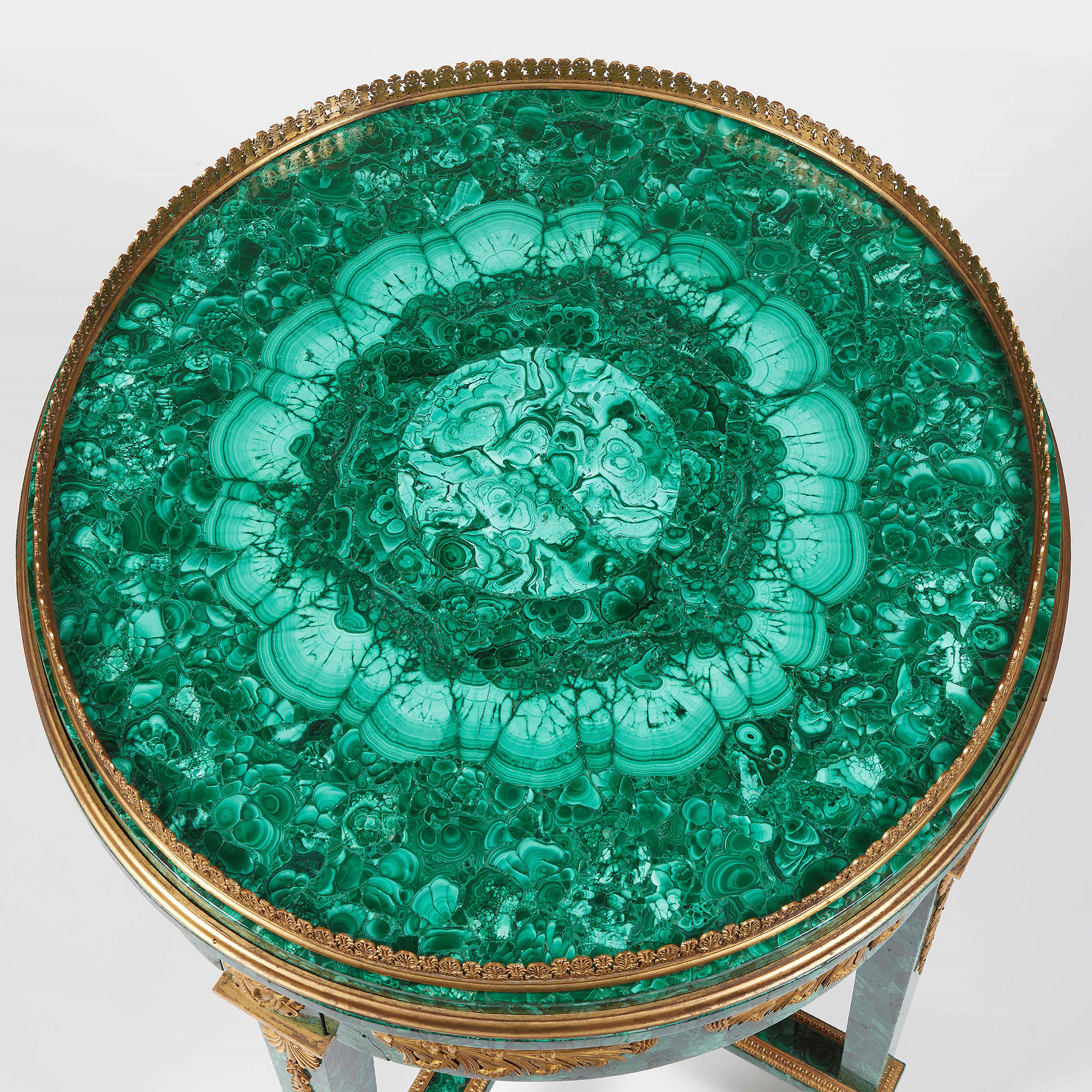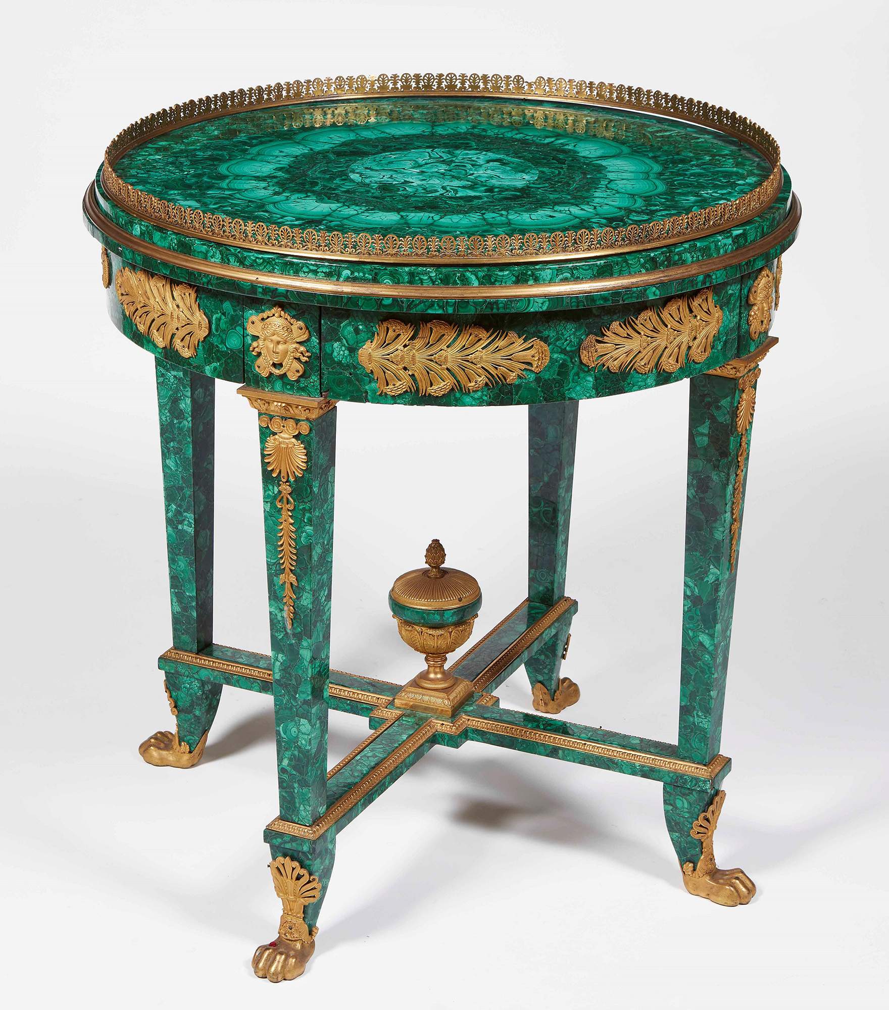 Importante tavolo da centro interamente lastronato in malachite. Fregi in bronzo dorato. Russia, XIX secolo Piano circolare ornato da ghiera traforata a motivi di palmette in bronzo. Gambe dritte riunite da crociera centrata da coppa e terminanti a zampe leonine. Fascia e gambe decorate da finissimi bronzi dorati e cesellati di manifattura francese., I bronzi cesellati e dorati decorarono ogni produzione importante e caratterizzarono gli interni fino a metà XIX secolo. Erano prodotti per oltre il novanta per cento a Parigi, dove esisteva un indotto in grado di occupare nelle sole fonderie artistiche oltre 9.000 operai., H. 77 cm