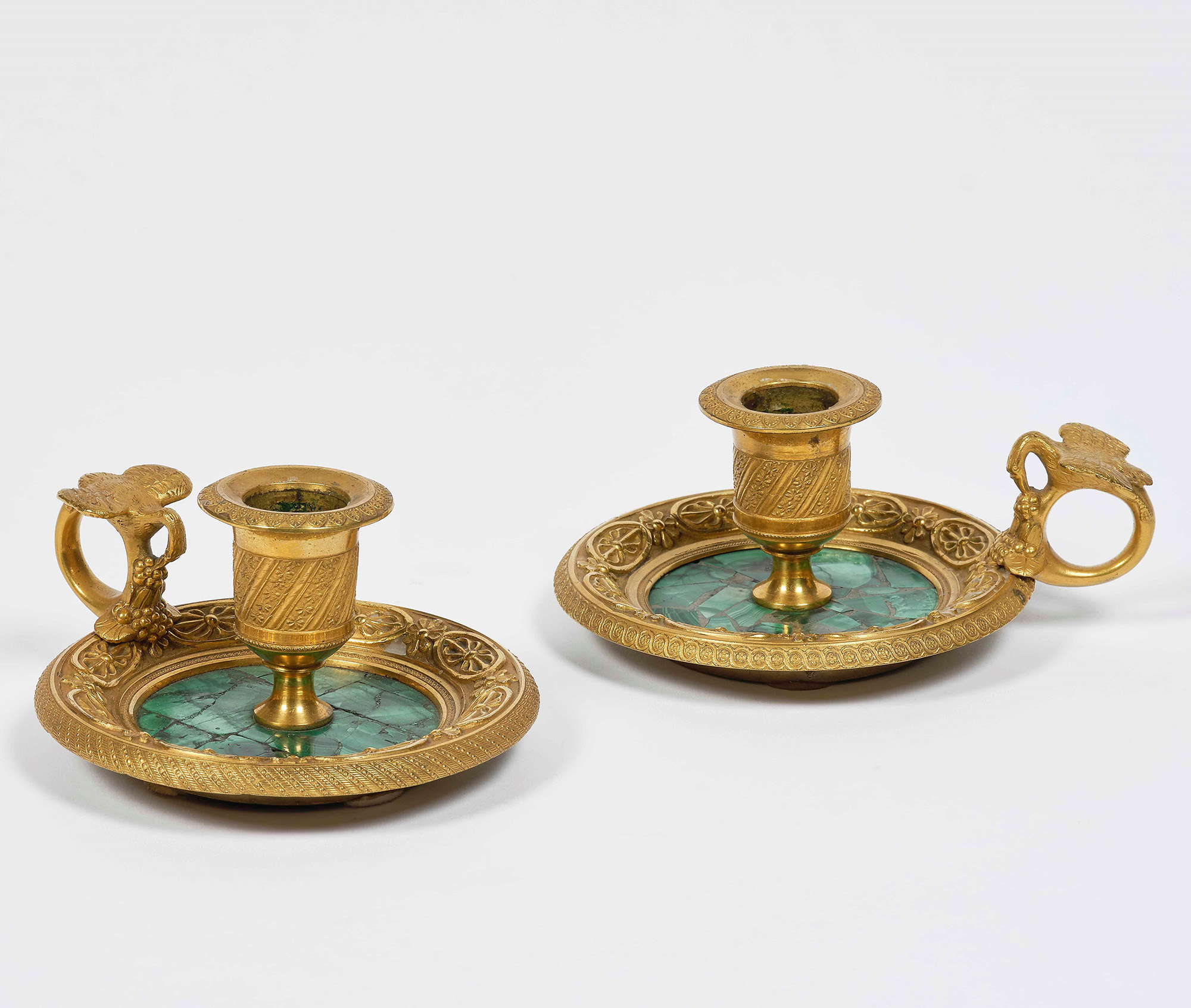 Coppia di bugie in bronzo dorato e malachite. Russia, Epoca primo Impero...