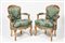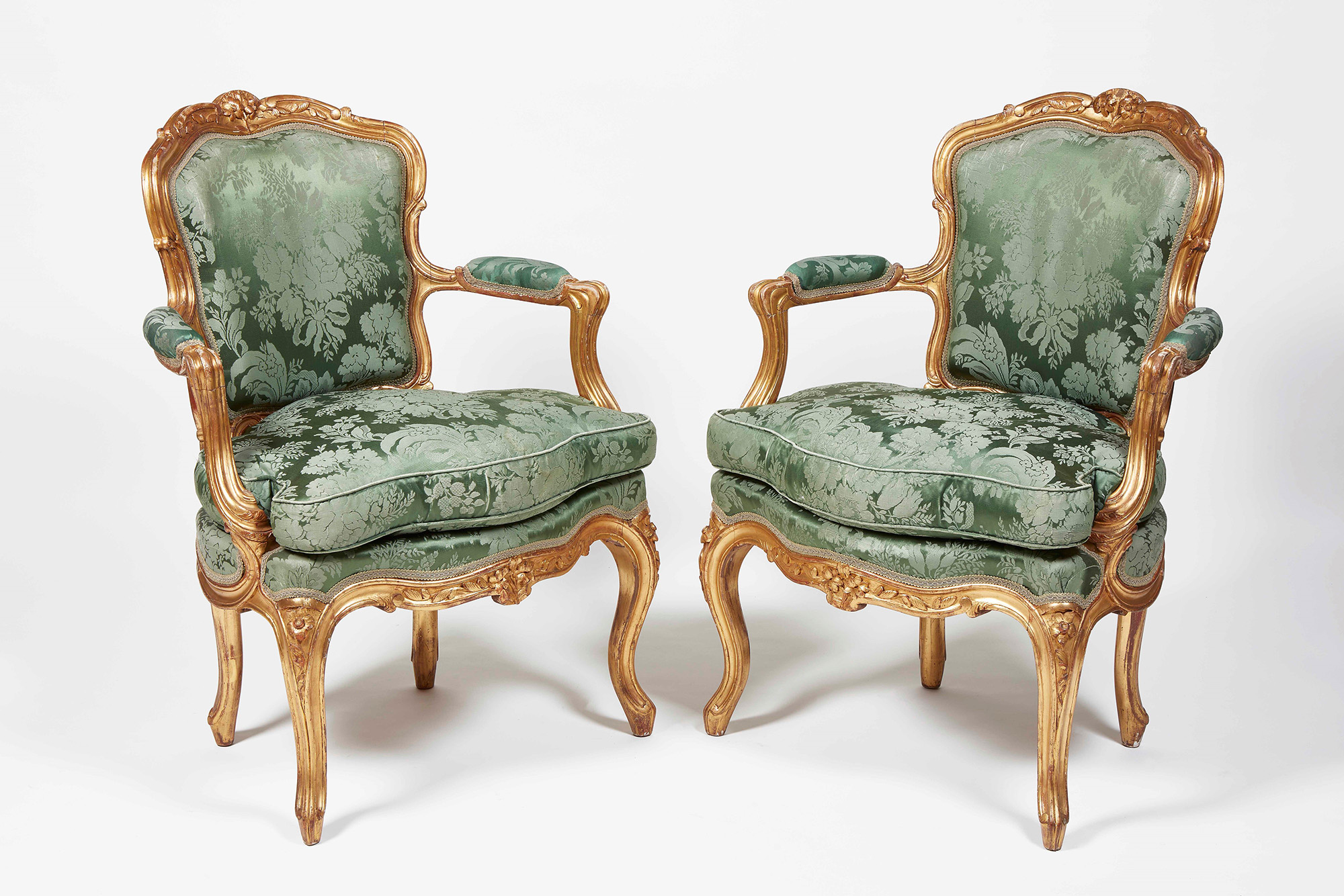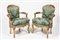 Serie di quattro poltrone e un divano in legno intagliato, laccato e dorato. Francia XIX secolo Di forma mossa con decori intagliati a motivi fogliacei e floreali, W. 70 - D. 65 - H. 90 cm