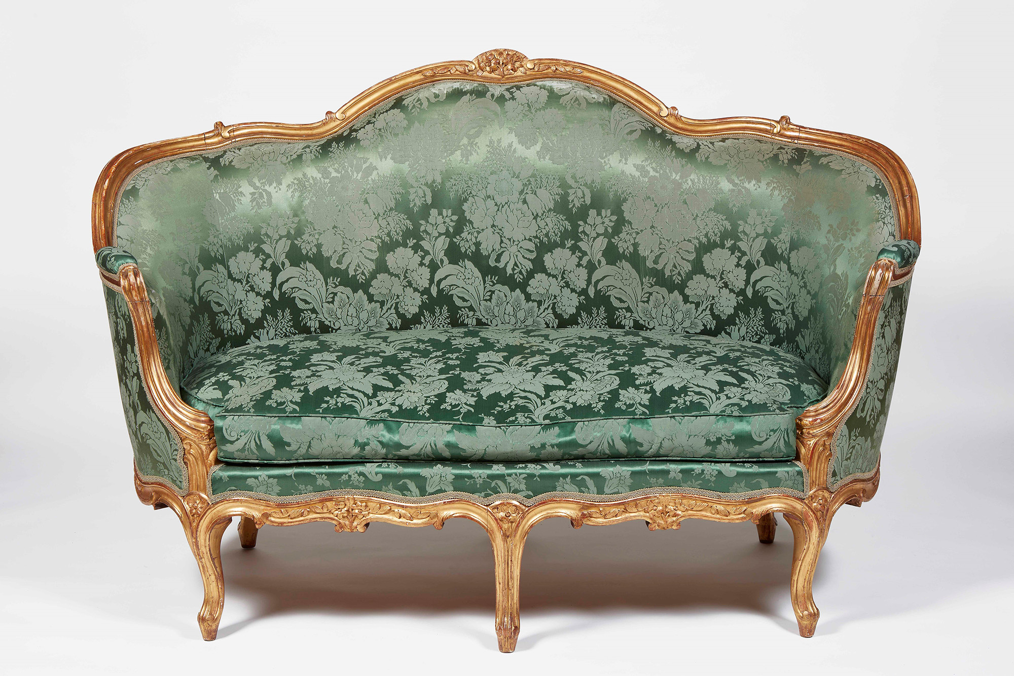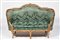 Serie di quattro poltrone e un divano in legno intagliato, laccato e dorato....