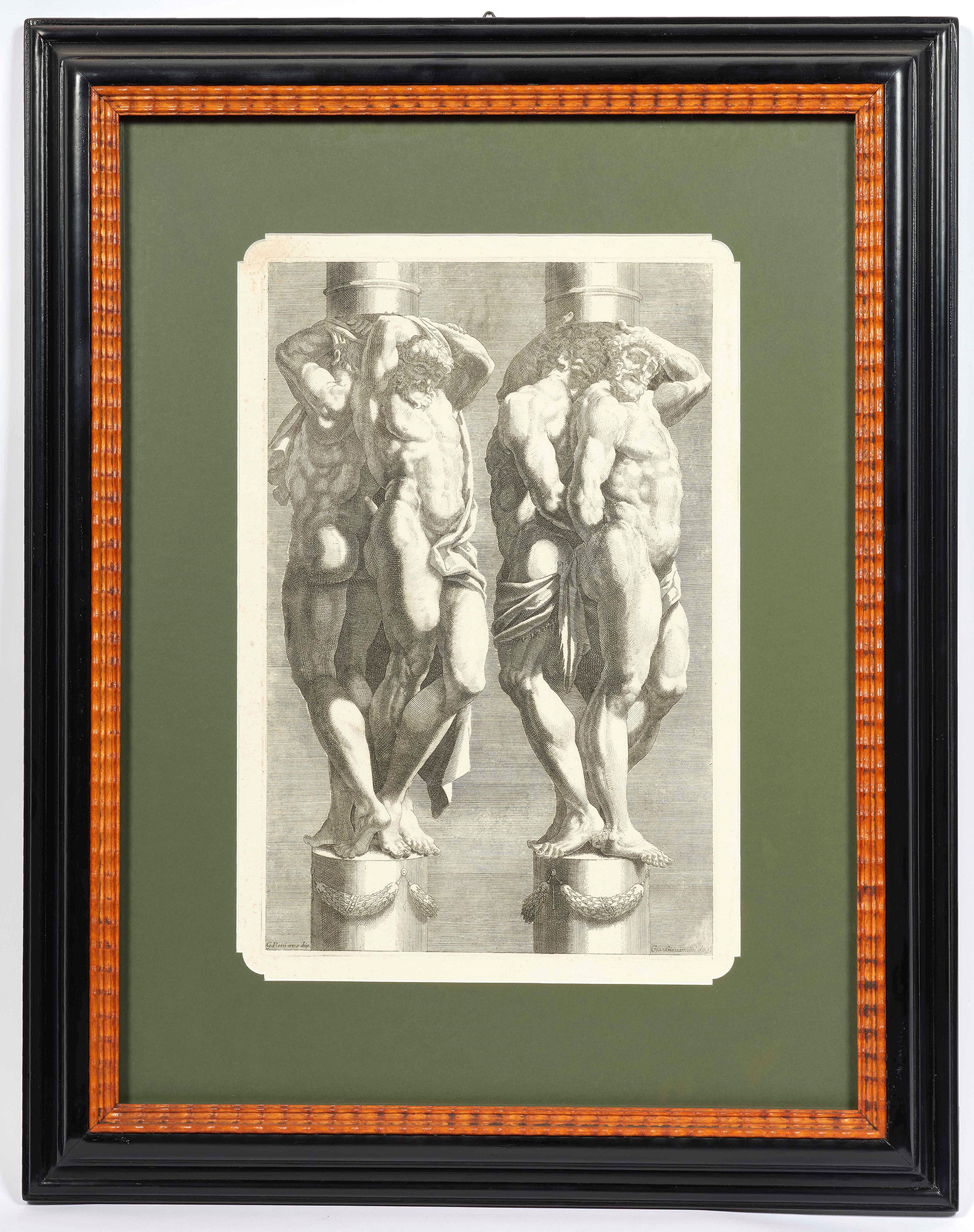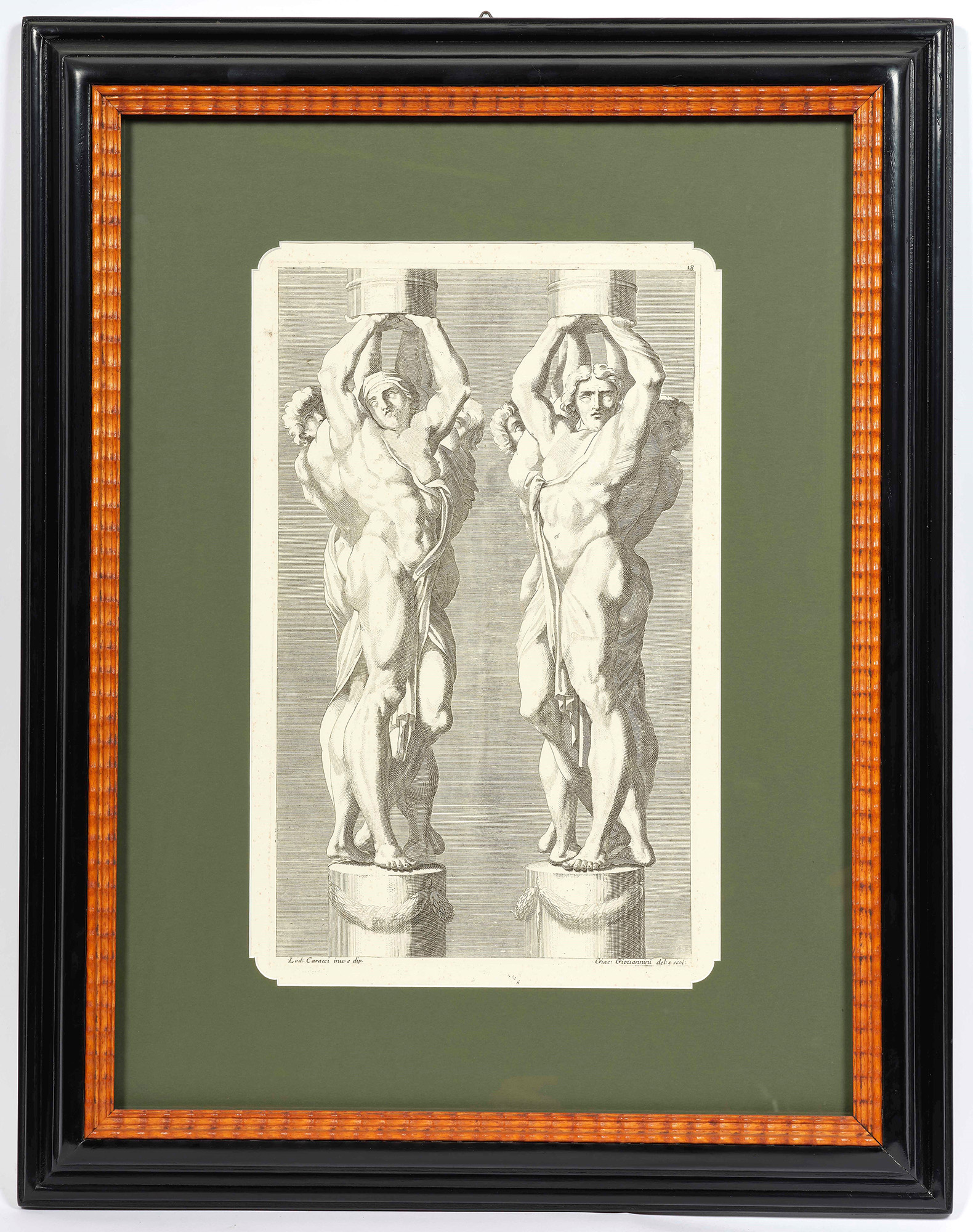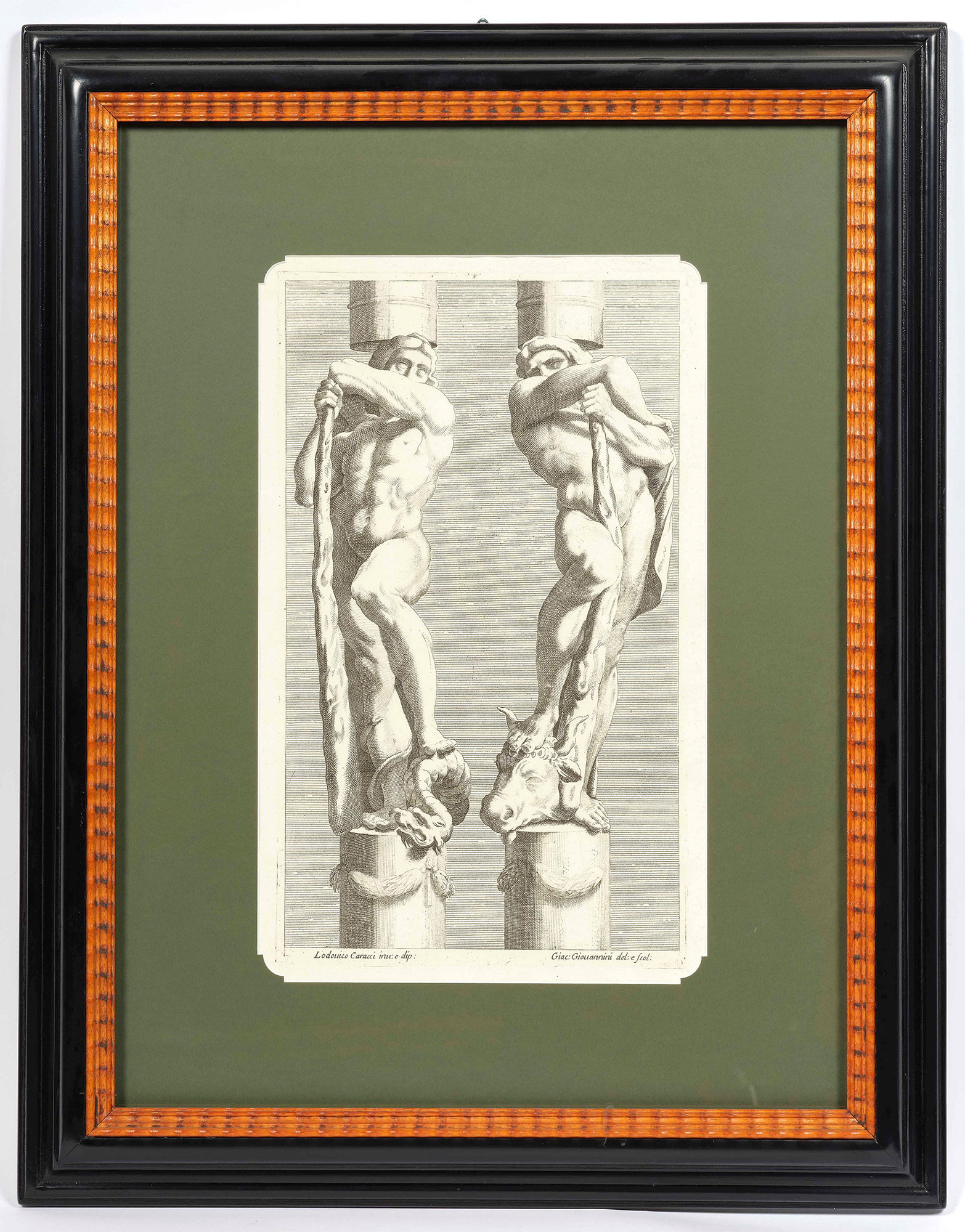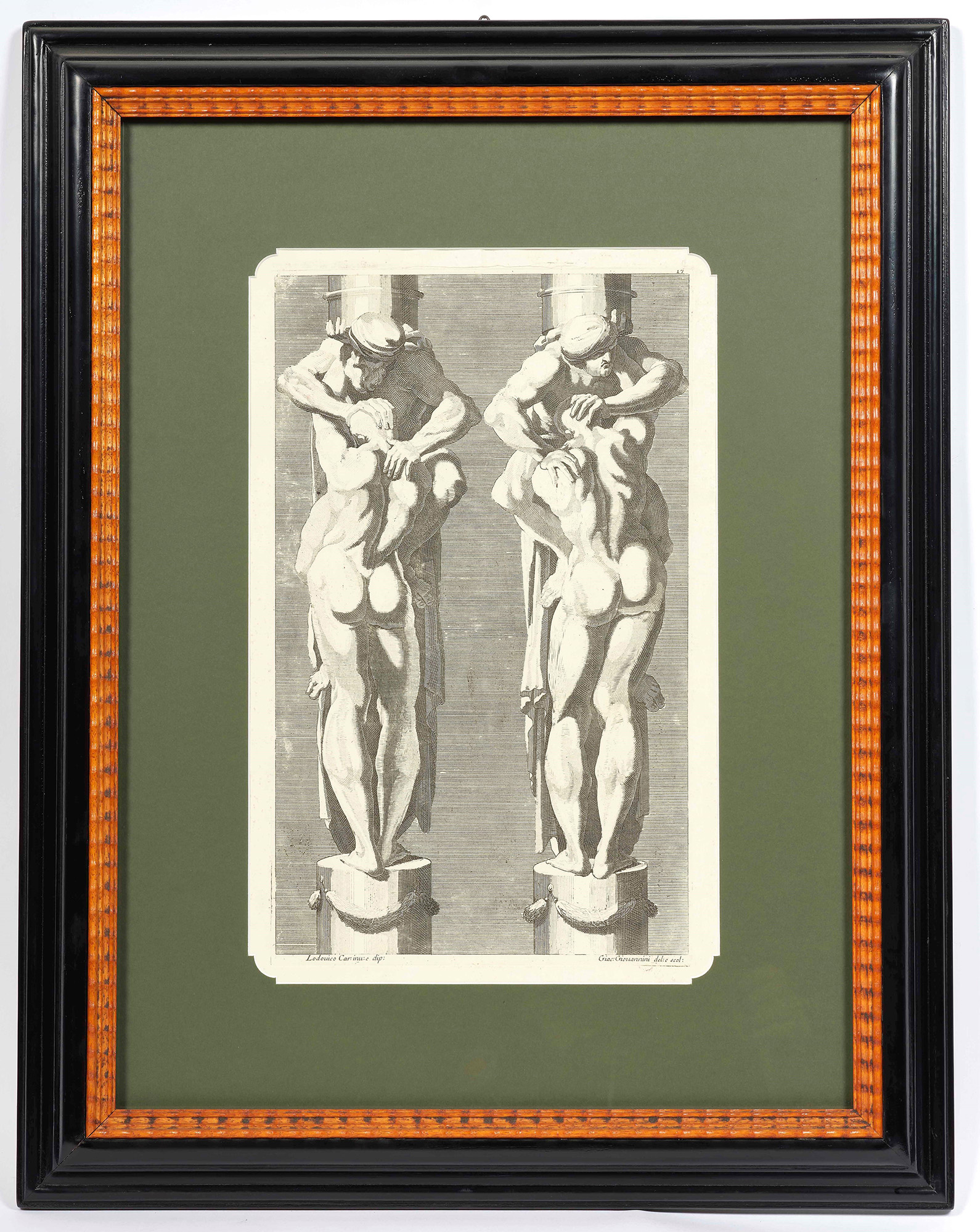 Il Claustro di S. Michele in Bosco, 1694, Cariatidi Quattro incisioni. Carracci Ludovico (1555-1619) inventore; Giovannini Giacomo Maria (1667-1717) incisore, W. 23 - H. 37 cm, In basso a sinistra "Lodovico Car. Inv: e dip:". A destra "Giac: Giovannini del: e scol:", Serie di 20 fogli realizzati da Giovannini ed editi a Bologna nel 1694 con il titolo: "Il Claustro di S. Michele in Bosco". La pubblicazione, curata da Carlo Cesare Malvasia, riproduceva le storie di san Benedetto affrescate tra il 1603 e il 1604 nel chiostro del convento di S. Michele in Bosco a Bologna da Ludovico Carracci e alcuni dei suoi allievi dell'Accademia, sui disegni di Giovannini.