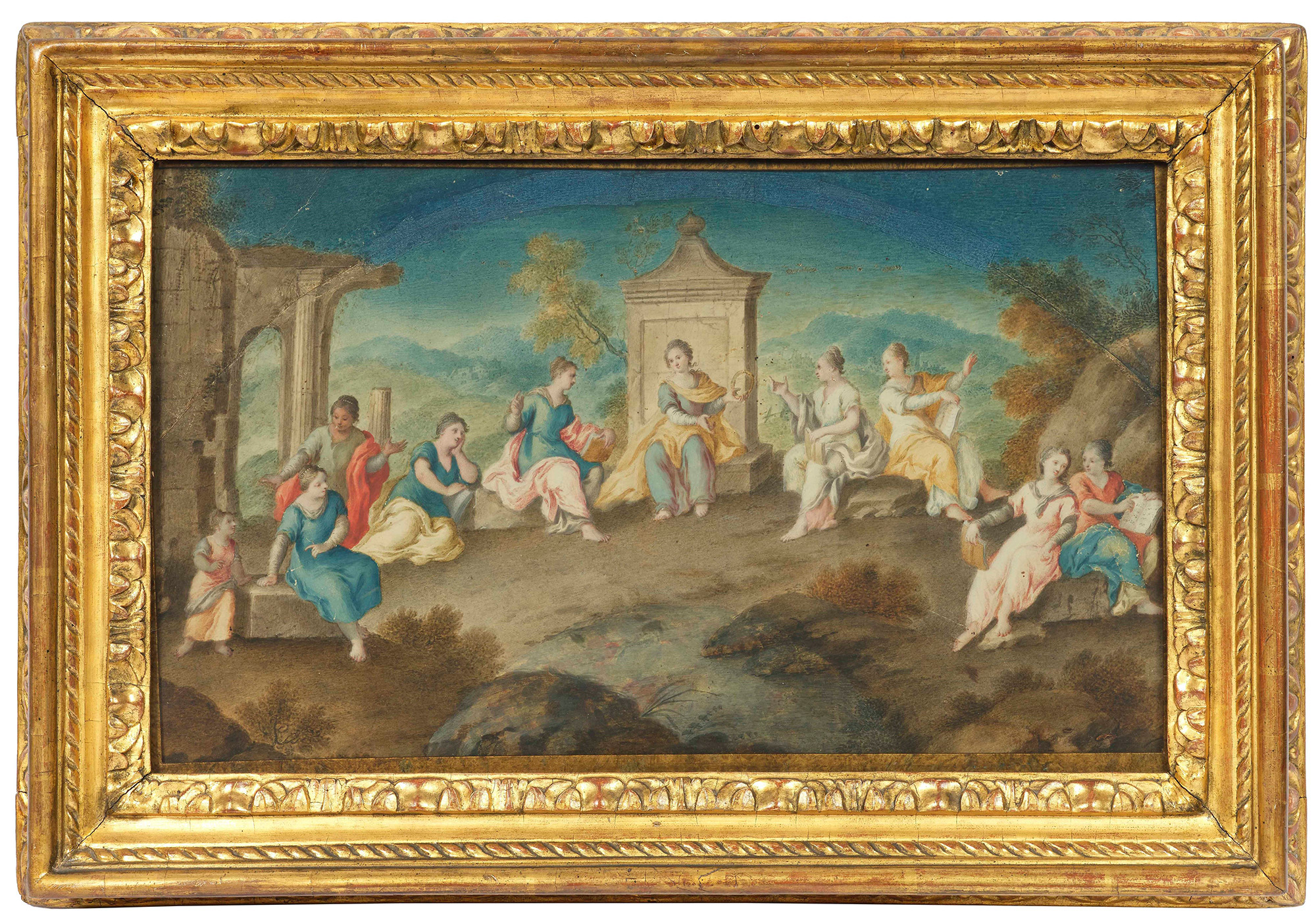 Scene mitologiche Scuola napoletana del XVIII secolo coppia dipinti, in cornici dorate, olio su pergamena, W. 43 - H. 26 cm