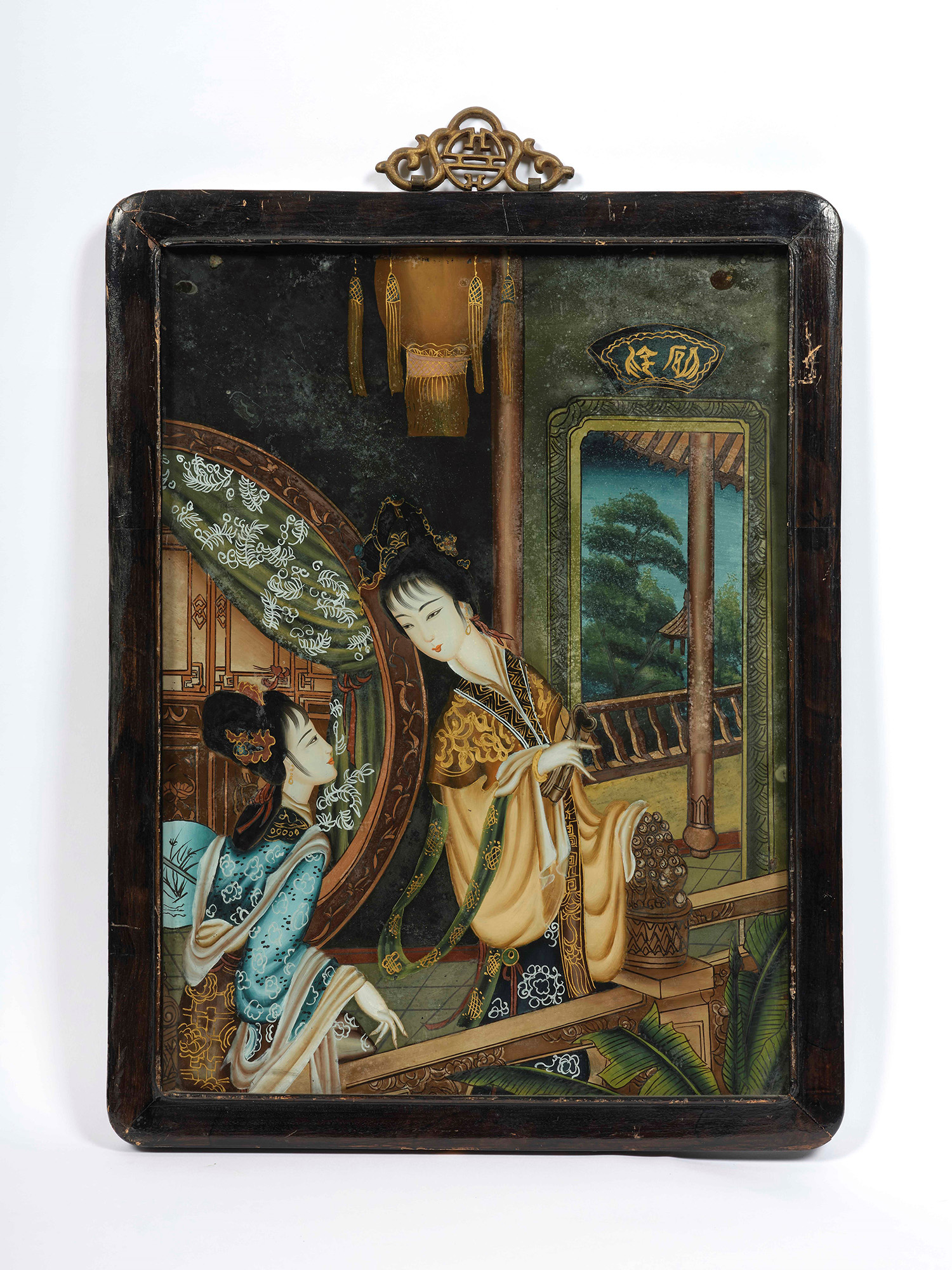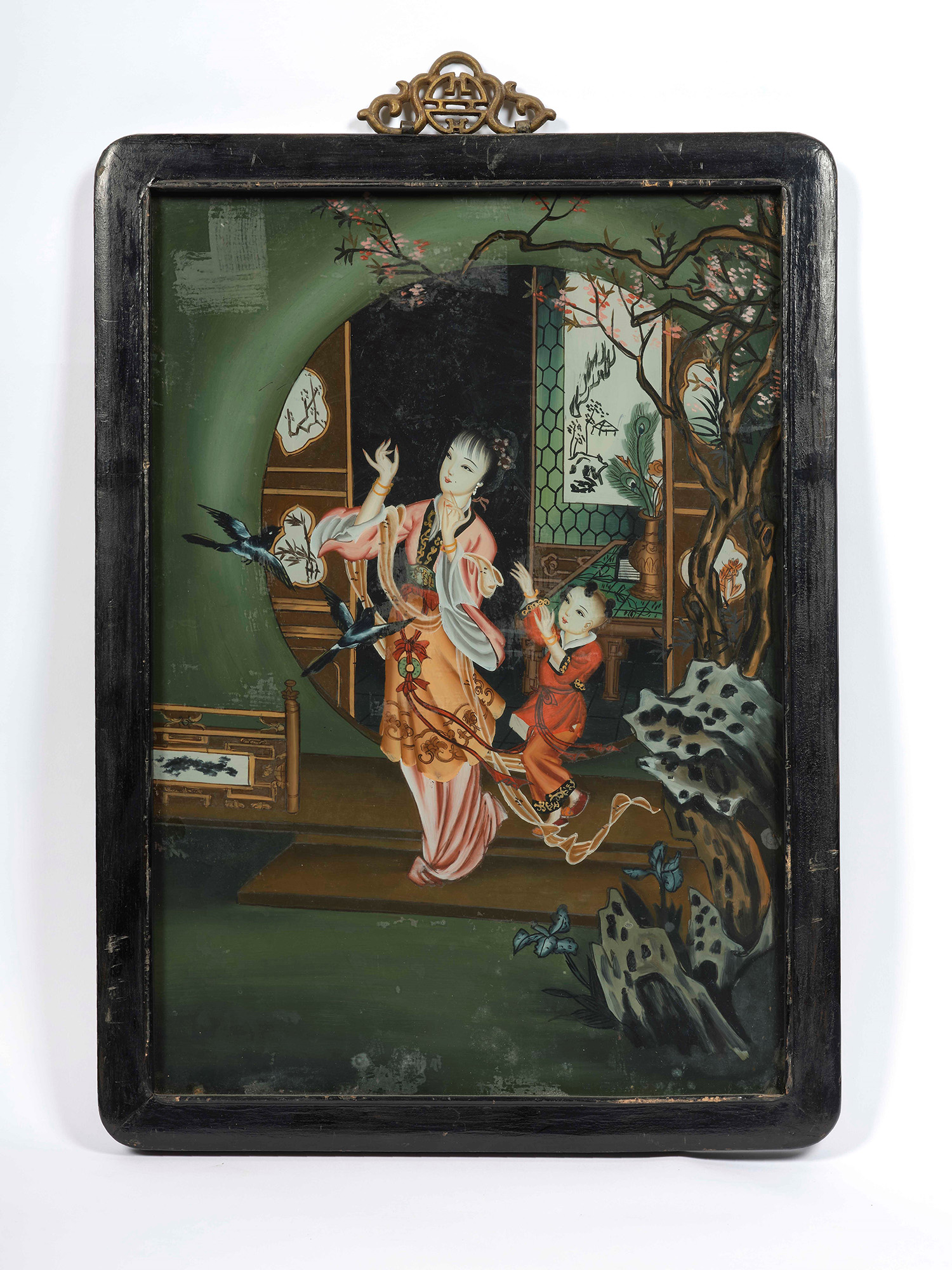 Coppia di dipinti su vetro raffiguranti episodi della vita di una Geisha,...