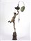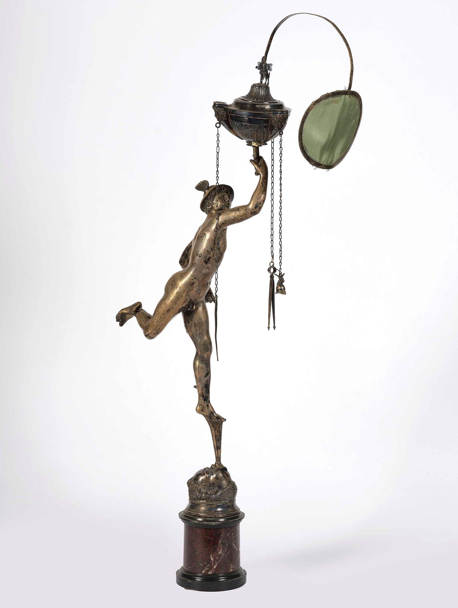 Lucerna in argento raffigurante Mercurio. Roma, 1830 circa. Punzone Stato Pontificio. Argentiere Angelo Giannotti (1824 - 1865) Base sbalzata a volto di Eolo su cui poggia la figura di Mercurio, ispirata al modello di Giambologna, che sostiene la coppa porta olio a tre becchi, completa di tre attrezzi e ventola. Coperchio sormontato da figura alata con cane. Sostegno a mezza colonna in marmo di epoca posteriore, Alt. 86 cm