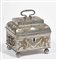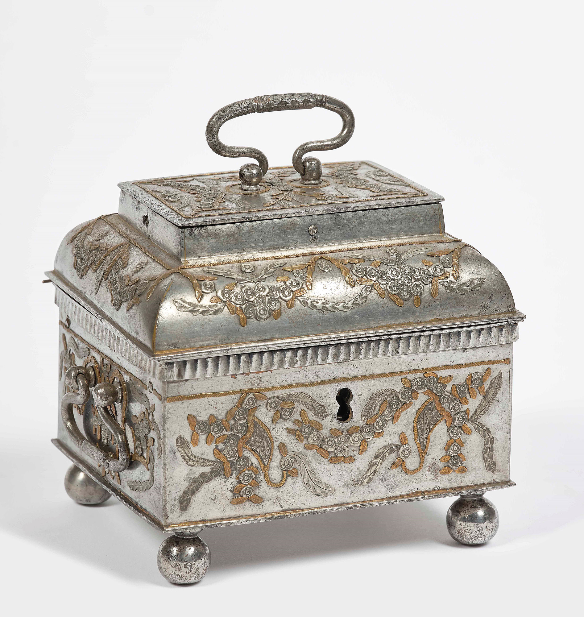 Cofanetto portagioie. Lamina d’acciaio forgiato, inciso e dorato. Russia probabilmente Tula. Inizi del XIX secolo Con segreti, decori con festoni di rose in parte dorati e a rilievo, poggiante su piedini a sfera, cm 12x9x11