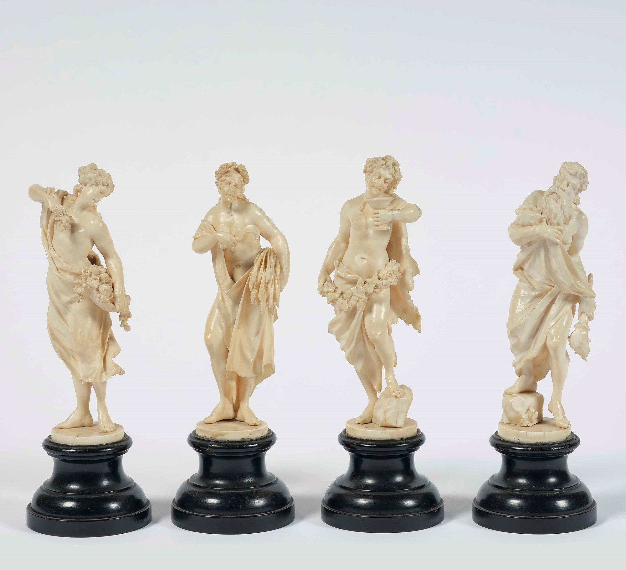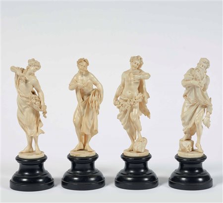 Le quattro stagioni. Avorio scolpito e basi in legno tornito ed ebanizzato. Dieppe, Francia XVIII-XIX secolo, ambito di Jean-Antoine Belleteste (Dieppe 1731-1811) altezza cm 14, base cm 4