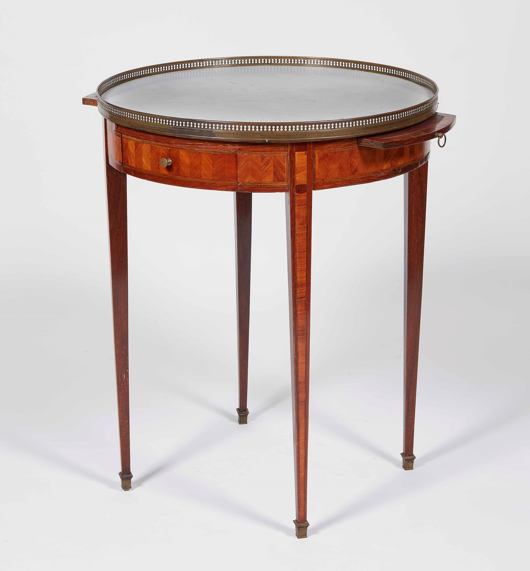 Tavolino rotondo lastronato in essenze pregiate. Francia, stampigliato J.M. Valette, XVIII-XIX secolo gambe ad obelisco con piedini in bronzo dorato, due cassetti e due tiretti sulla fascia, piano incassato in marmo bianco circondato da un anello in metallo traforato, altezza cm 75, diametro cm 60