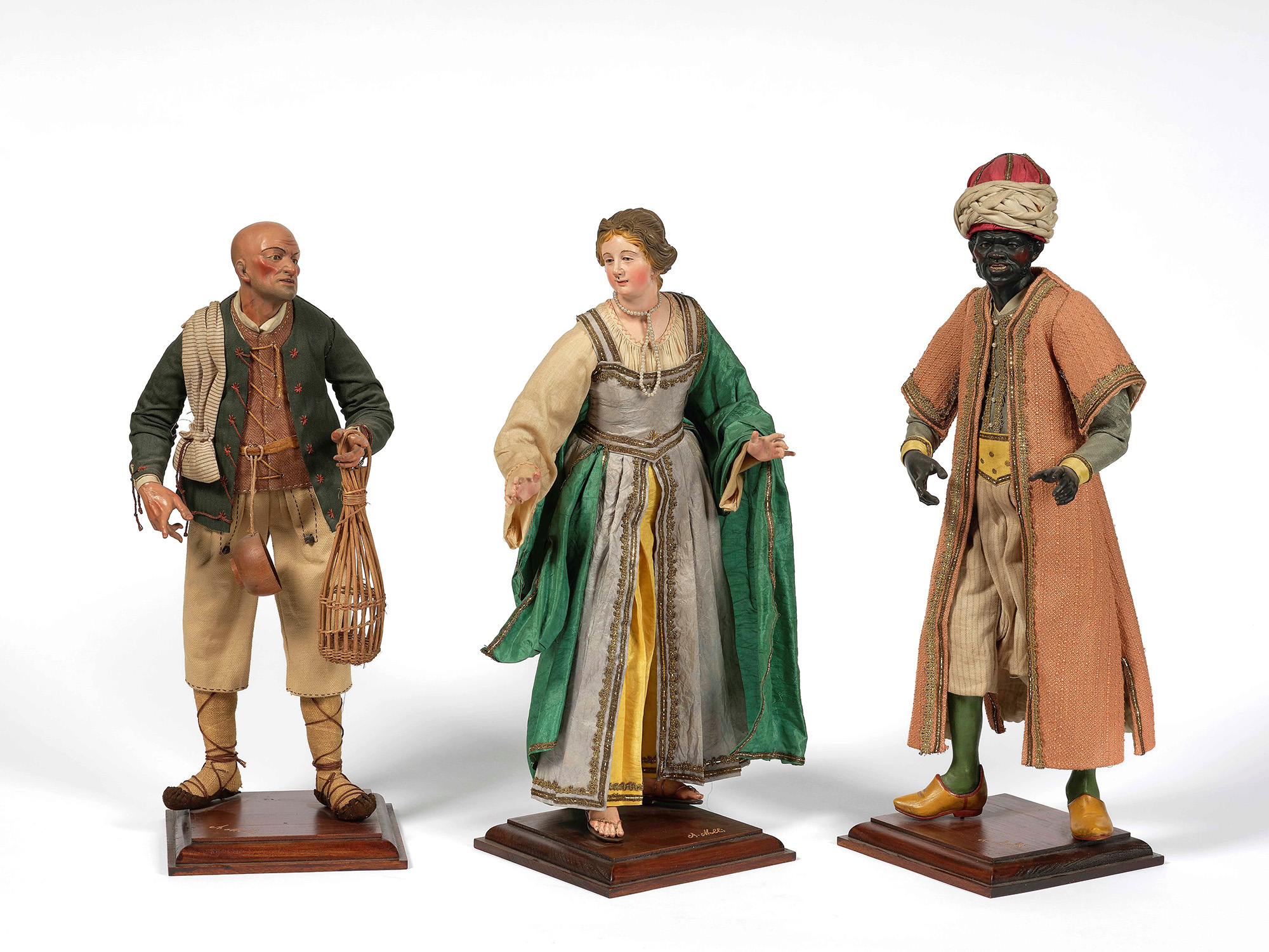 Insieme di figure presepiali comprendente un venditore una giovane donna e un moro. Terracotta dipinta, vetro e stoffa. Arte napoletana del XX secolo Figura di venditore altezza cm 38,5; figura femminile altezza cm 39,5; figura di moro altezza cm 43