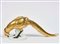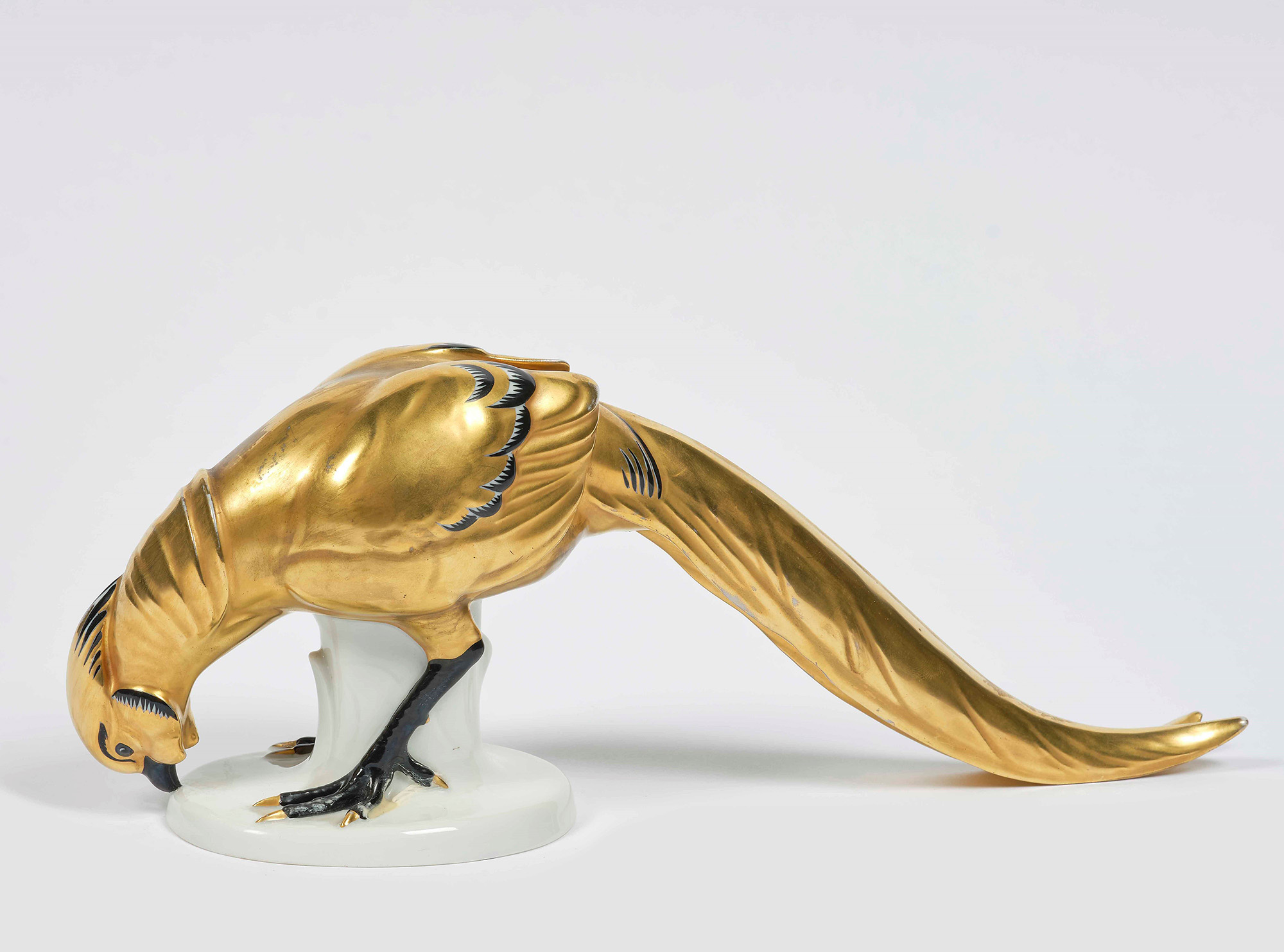 Scultura di pavone Germania, Turingia, Manifattura di Volkstedt-Rudolstadt, ultimo quarto del XX secolo Porcellana. Marca: “FG” incrociate e specchiate e “1762” (data di fondazione della manifattura) in blu. Altezza cm 12,3; cm 32 x 8. Conservazione: due minime sbeccature; lievi usure all’oro, , La figura, dipinta in oro e nero, raffigura un elegante pavone dalla lunga coda, nell’atto di beccare il cibo da terra. Poggia su una base piatta a zolla rotonda da cui spunta un tronco d’albero che funge da sostegno per le fragili zampe del volatile