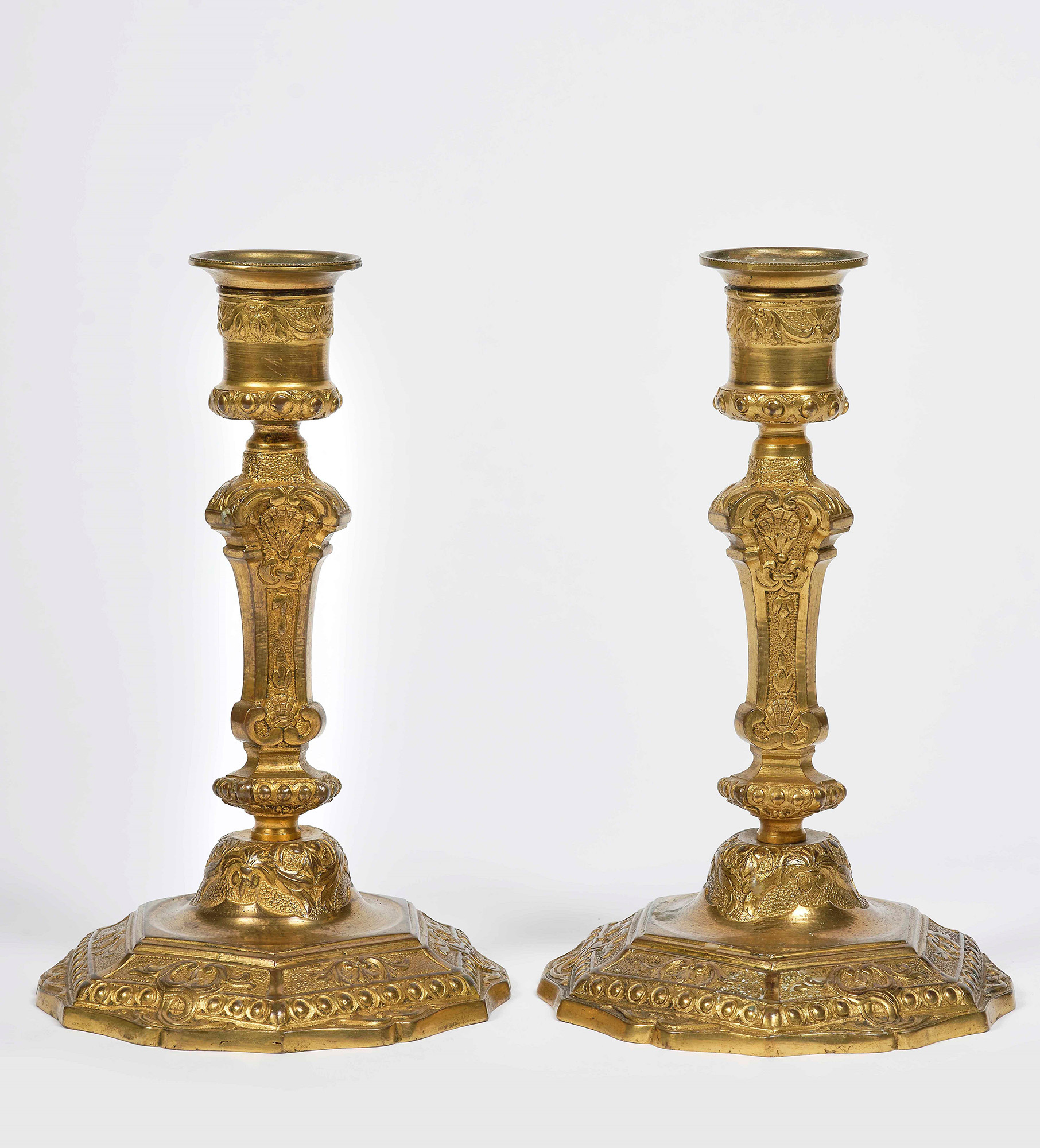 Coppia di candelieri in bronzo dorato e cesellato. Francia XIX secolo Fusto a balaustro, base mistilinea, H. 18 cm, Galleria Mossini, Mantova