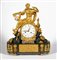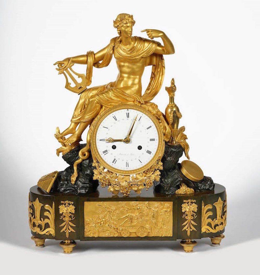 Pendola da camino in bronzo dorato e patinato. XIX secolo. Orologiaio "Noel Bourret Paris" Quadrante smaltato a numerazione romana per le ore firmato "Burret à Paris", sormontato da figura di Apollo con cetra a tutto tondo. Base ornata da placca raffigurante un corteo bacchico, Largh. 50 - Prof. 12 - Alt. 42 cm