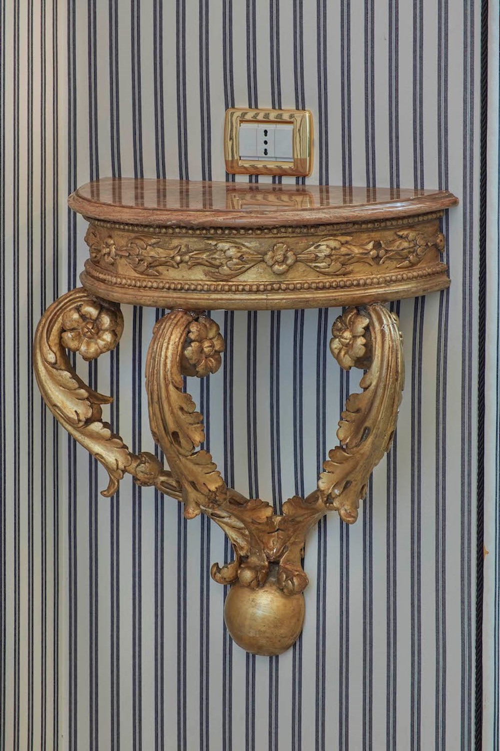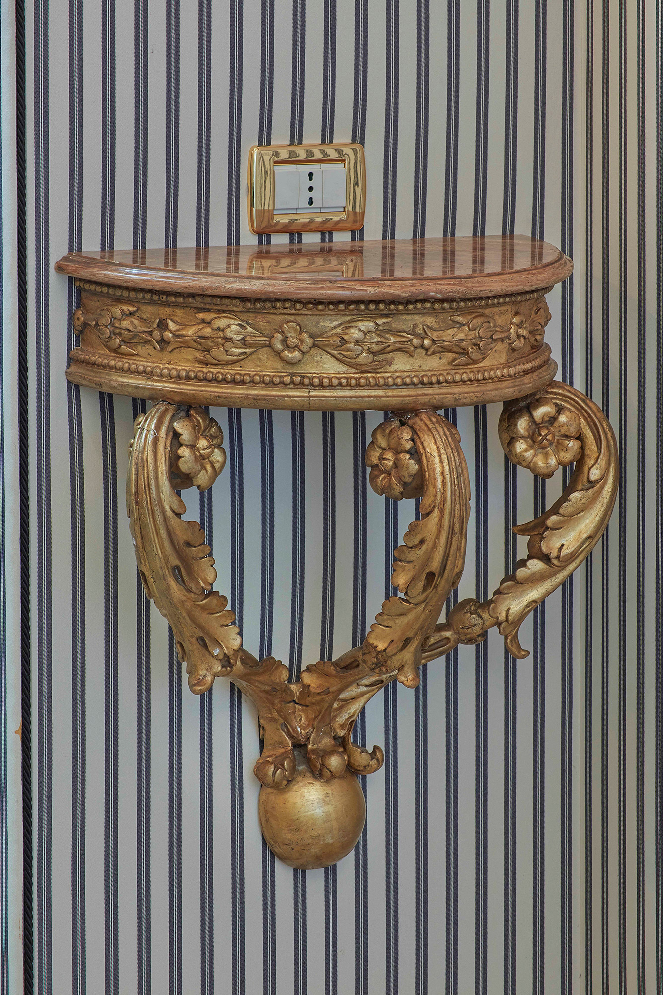 Coppia di piccole consolles pensili a demilune in legno intagliato e dorato....