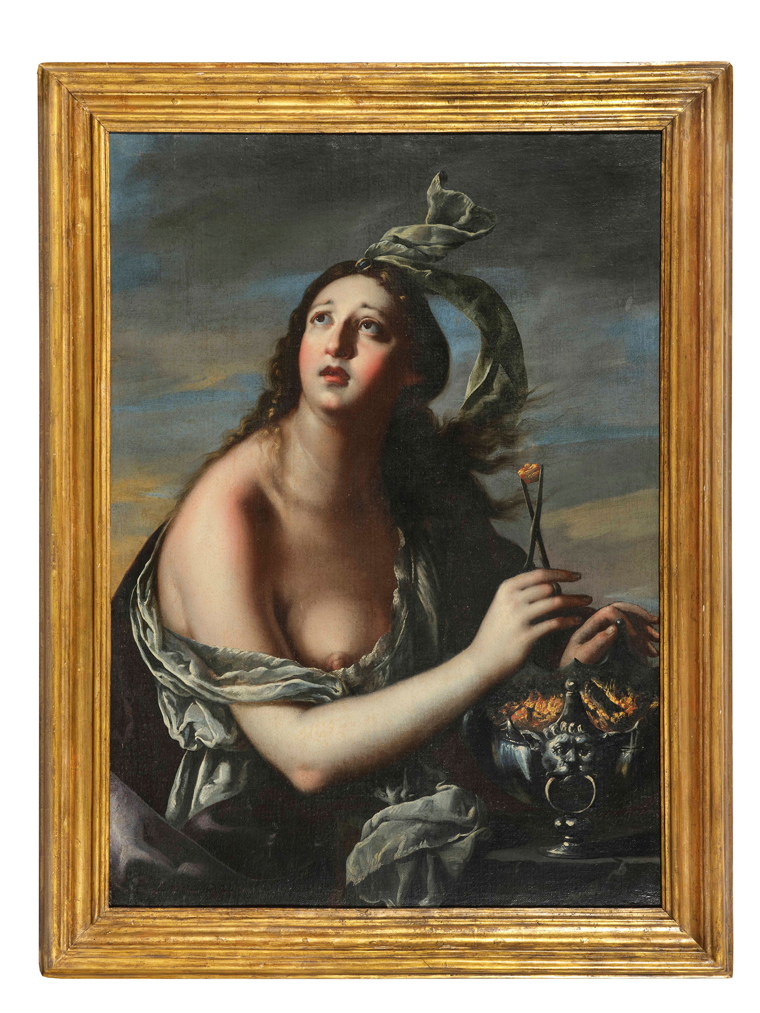 Antonio Domenico Triva (1626 Reggio Emilia-1669 Monaco di Baviera), Porzia in cornice dorata, olio su tela, cm 98x70, Prof. Ugo Ruggeri, S. Spirito Antichità, Firenze, Rifacendosi alla narrazione di Plutarco, Antonio Domenico Triva ritrae Porzia, figlia di Catone Uticense e moglie di Marco Bruto, uno dei protagonisti della cospirazione che portò all'uccisione di Giulio Cesare, nell'atto di togliersi la vita inghiottendo braci ardenti dopo il terribile fatto. , , "(...) E' tipica del Triva - allievo di Luca Ferrari da Reggio ma anche seguace del Guercino e interessato a Nicolò Ranieri -,anche in questo dipinto, la materia pittorica lucida e pastosa, la caratteristica lumeggiatura delle vesti, la stessa tipologia della figura femminile, dal volto allargato e dallo sguardo leggermente boopide, elementi che noi ritroviamo nella 'Figura femminile' della Cassa di Risparmio di Piacenza, nel 'Ero e Leandro' del Museo di Lons-Le-Saunier, nella 'Carità romana' del Museo Civico di Padova. (...)"