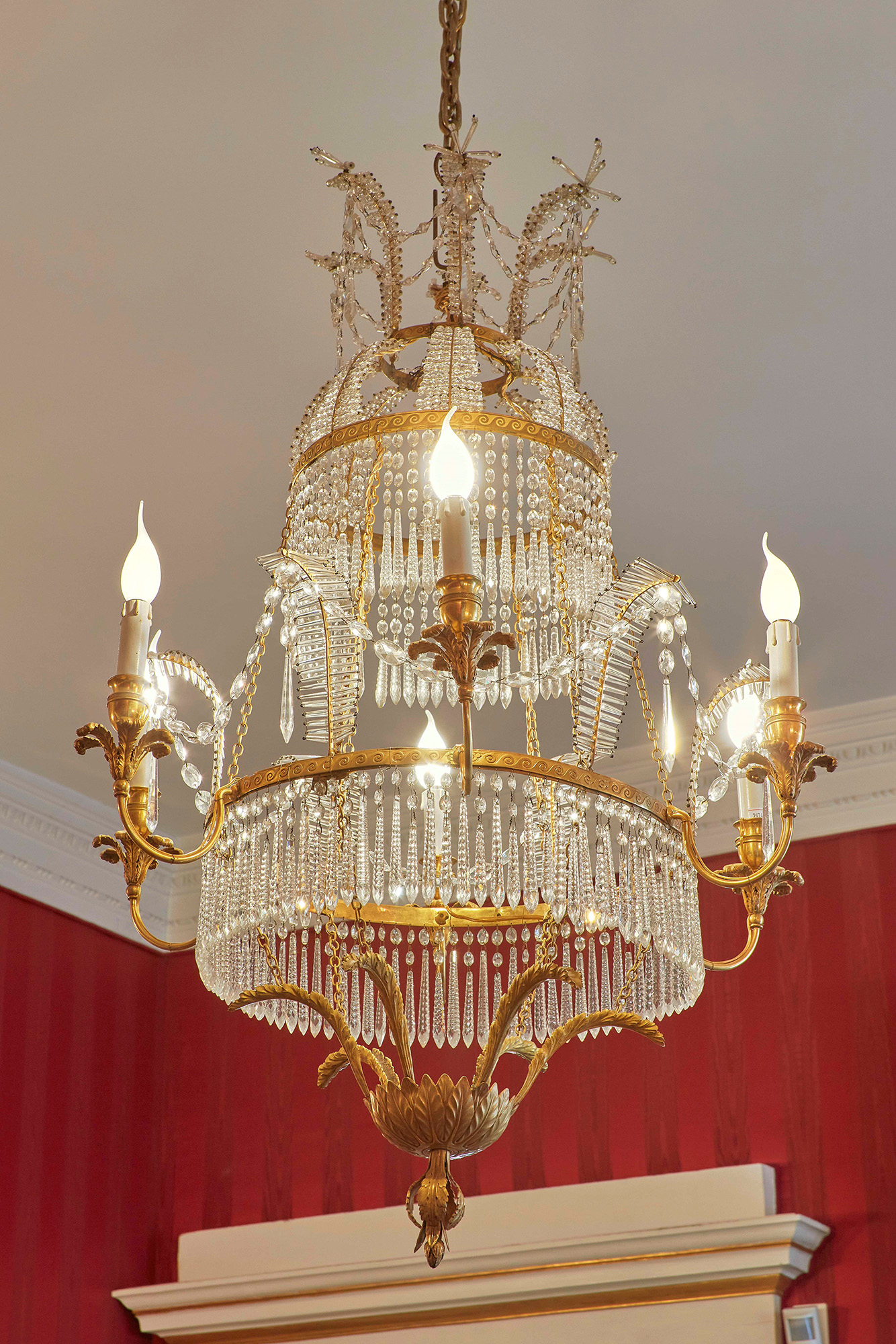 Raro lampadario a mongolfiera a sei fiamme con struttura in bronzo cesellato e dorato, pendagli in cristallo. Russia XIX secolo H. 110 cm, Antichità Maurizio Nobile, Bologna