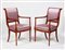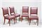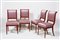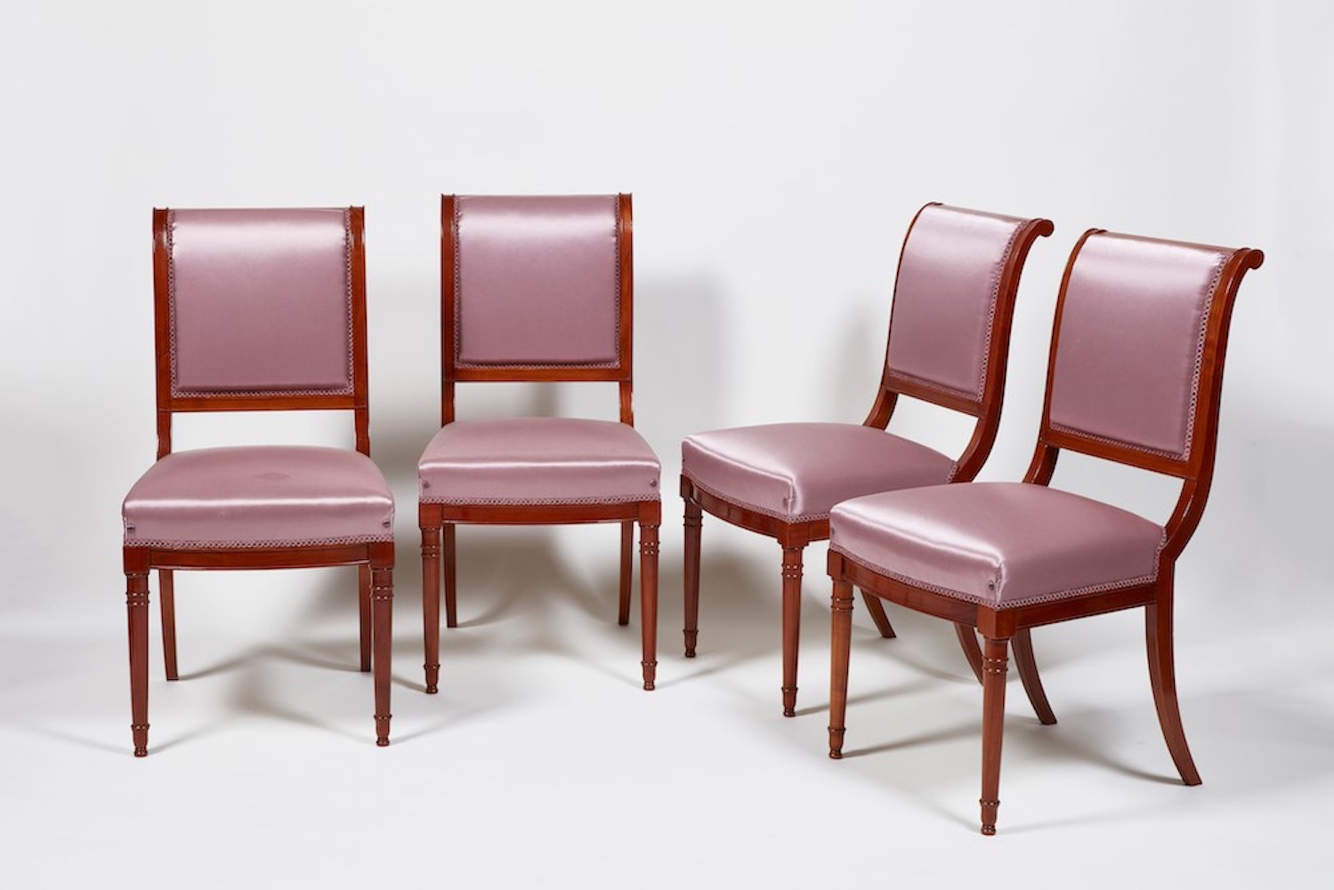 Otto sedie e due poltrone in noce in stile Direttorio, XX secolo Schienale estroflesso, gambe posteriori a sciabola. Rivestite in seta rosa, Largh. 41 - Alt. 90 cm