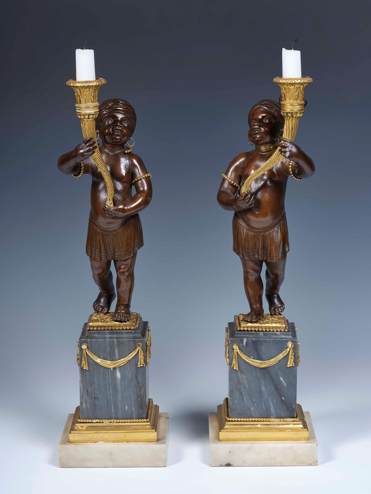 Coppia di rari candelieri in bronzo dorato e patinato. XVIII secolo Una base con incisione 1788, l'altra con iniziali I.J., A guisa di due bambini mori poggianti su base in marmo bianco e grigio, H. 43 cm, Antichità Maurizio Nobile, Bologna