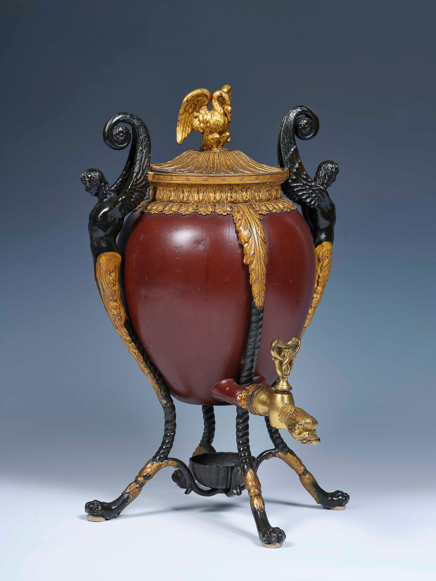 Samovar. Peltro laccato e dorato e bronzo dorato. Arte neoclassica, Russia (?) XVIII-XIX secolo Elegante contenitore dal corpo ovale poggiante su alte zampe ferine recante ai lati figure alate e decori a foglie d’acanto, Alt. 41 cm, La Chimera di Paola Cipriani Antiquario, Roma