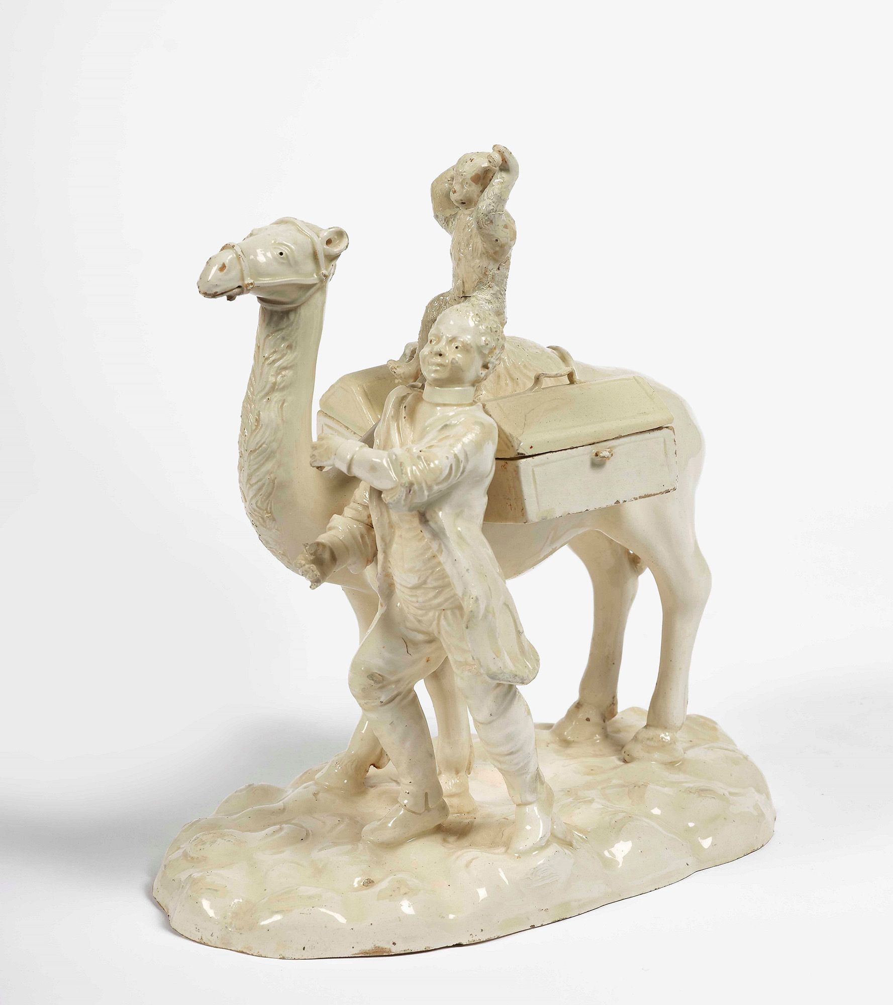 Gruppo di servitore con dromedario Veneto, (Este, manifattura Contiero?), XIX secolo Terraglia color crema. Marca: assente. Dimensioni: altezza cm 22,5; cm 22 x 12. Conservazione: scimmietta con vecchi restauri all’altezza della vita e delle braccia; restauri ad alcune dita di una mano del servitore e alla maniglia di una valigia; briglie mancanti; due felature al coperchio di una valigia; insignificanti sbeccature , , Gruppo plastico composto da dromedario con scimmietta sul dorso tra due valigie dal coperchio amovibile, guidato da giovane servitore africano. Il modello di questo gruppo scultoreo in terraglia è stato prodotto ad Este dalla manifattura Franchini. Il nostro è forse più tardo, probabilmente sfornato nella fabbrica Contiero (vedi il modello originario in G.Barioli, Mostra dell’Antica Ceramica di Este, catalogo della mostra 1960, fig.29). Nel 1939 alla storica mostra veneziana di Cà Rezzonico “Maioliche venete del Settecento” è stato esposto un esemplare simile e pubblicato sul relativo catalogo (G.Lorenzetti, Maioliche venete del Settecento, Venezia 1939, fig. 203), cm 21x12,5x23,5