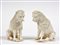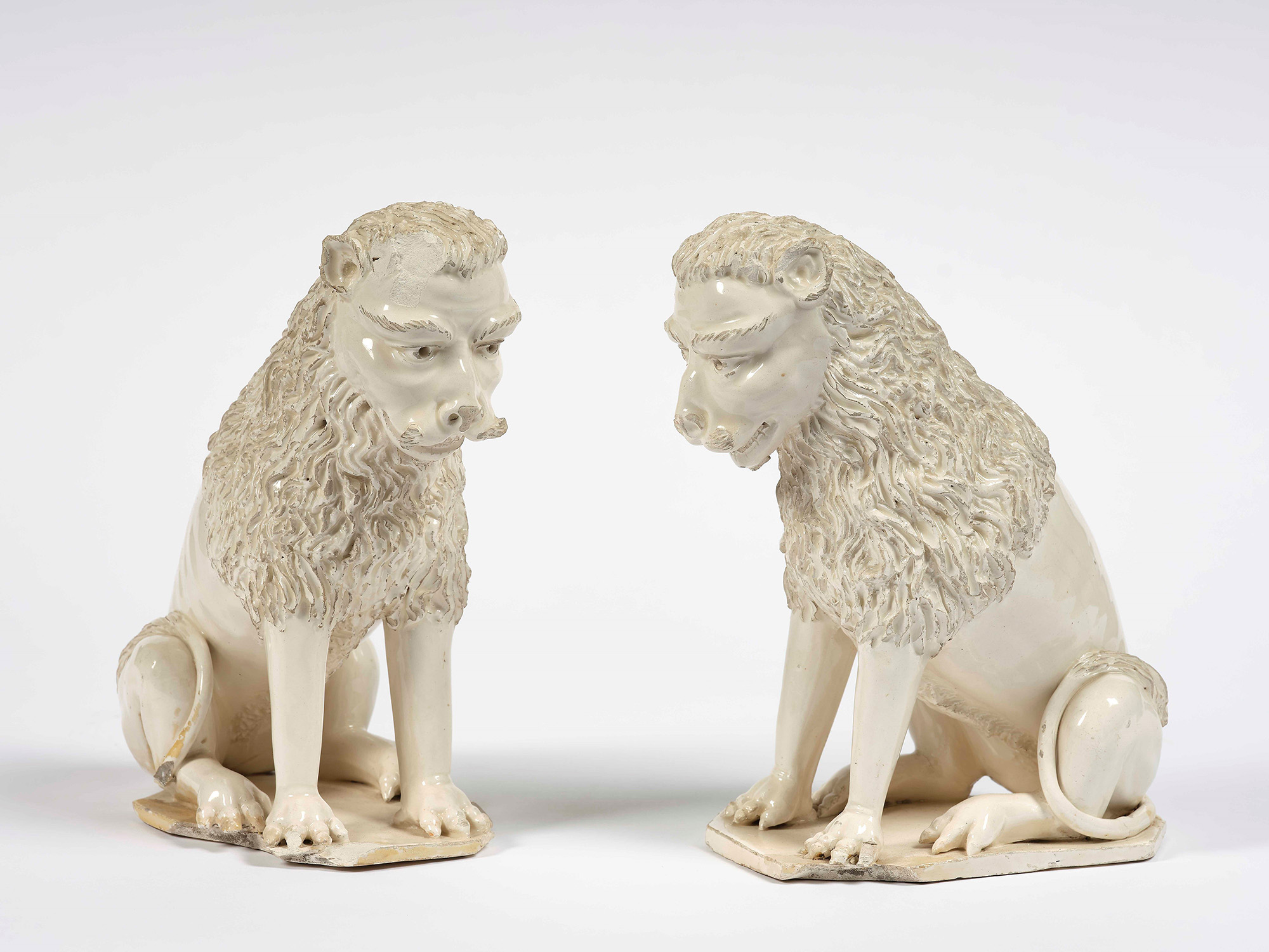 Coppia di sculture di leoni Francia (Luneville ?), XIX secolo Terraglia color crema. Marca: assente. Altezza cm 22 circa; cm 18 x 10. Conservazione: mancanze alle basi, a qualche dita e parte della coda di un leone; usure di smalto, , Due figure di leone seduti posti su una sottile base poligonale mistilinea. Lo stile plastico mostra somiglianze con quella dei leoni apotropaici alla base dei busti di re Louis XV e della moglie Maria Leszczyńska modellati a Luneville nel 1745 da Lemoine e conservati al Museo della Ceramica di Sèvres