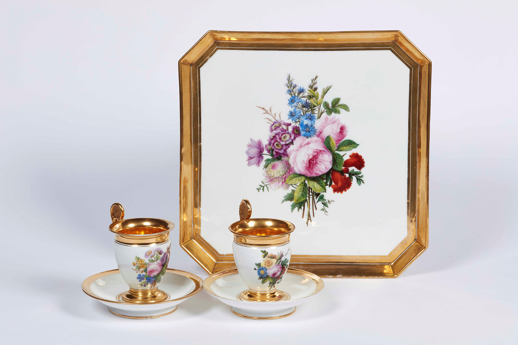 Un vassoio con due tazze Parigi, Atelier Feuillet, 1817-1834 Porcellana. Marca: “Feuillet rue de la Paix n° 20” in verde. Dimensioni: vassoio cm 31,5 x 31,5; altezza tazza cm 11; diametro piattino cm 14,8. Conservazione: qualche insignificante usura all’oro, , Il vassoio e le due tazze con il loro piattino sono state dipinte in policromia con un mazzolino di fiori fini di grande qualità. I bordi sono profilati da dorature., Tra le più belle decorazioni su porcellana, uscite dalle botteghe parigine in epoca Restaurazione, sono da menzionare proprio quelle della bottega Feuillet
