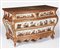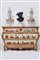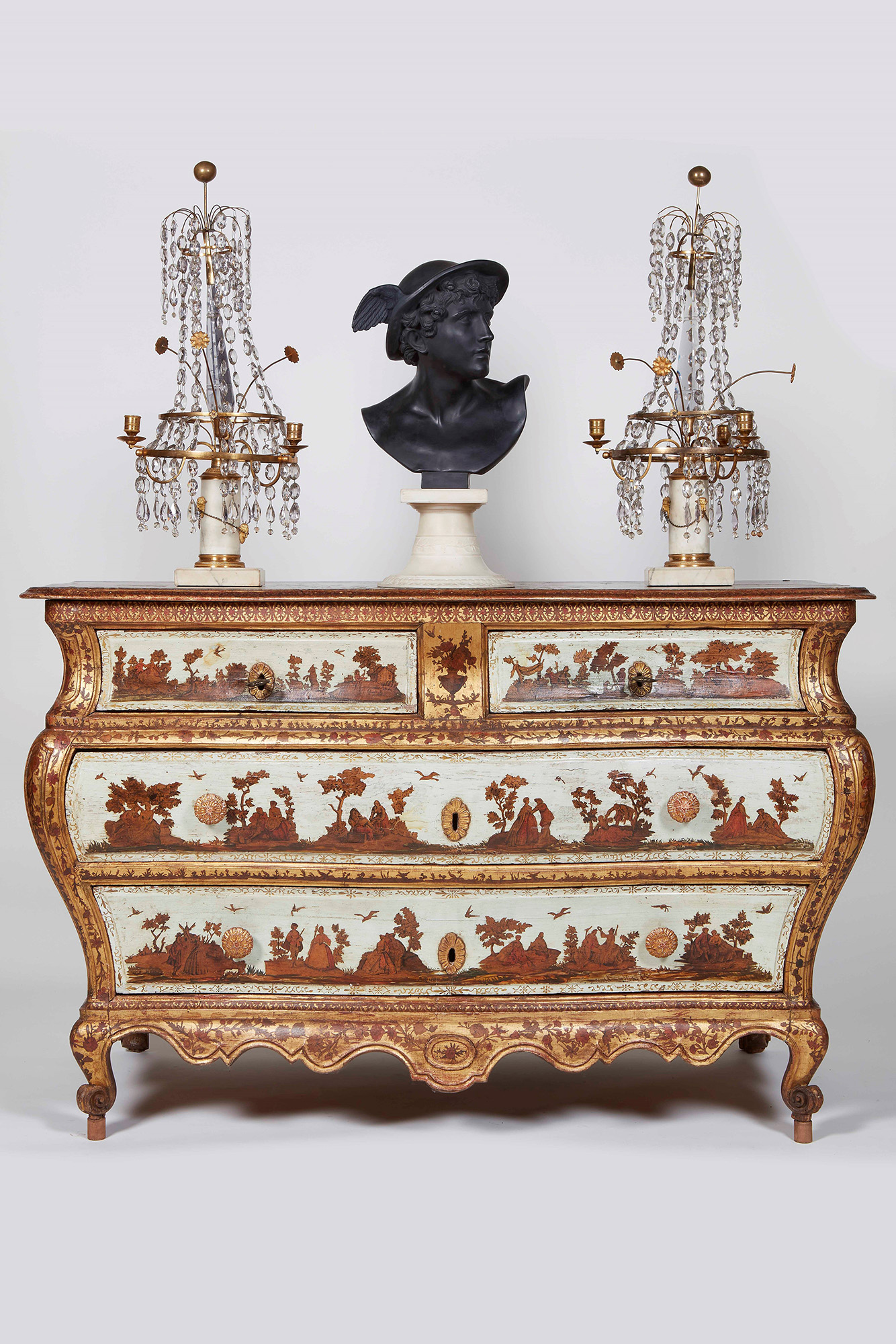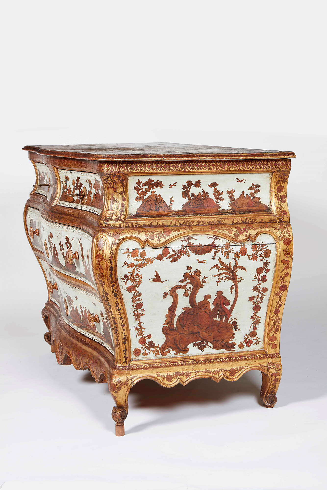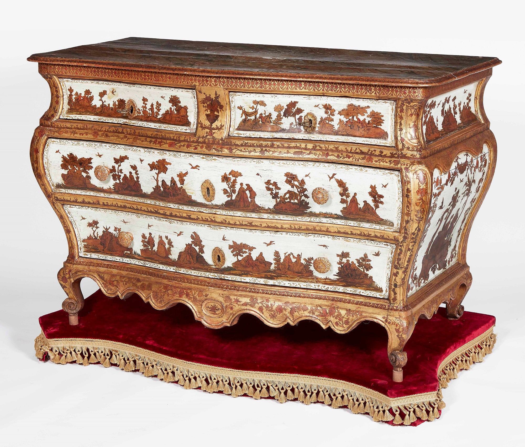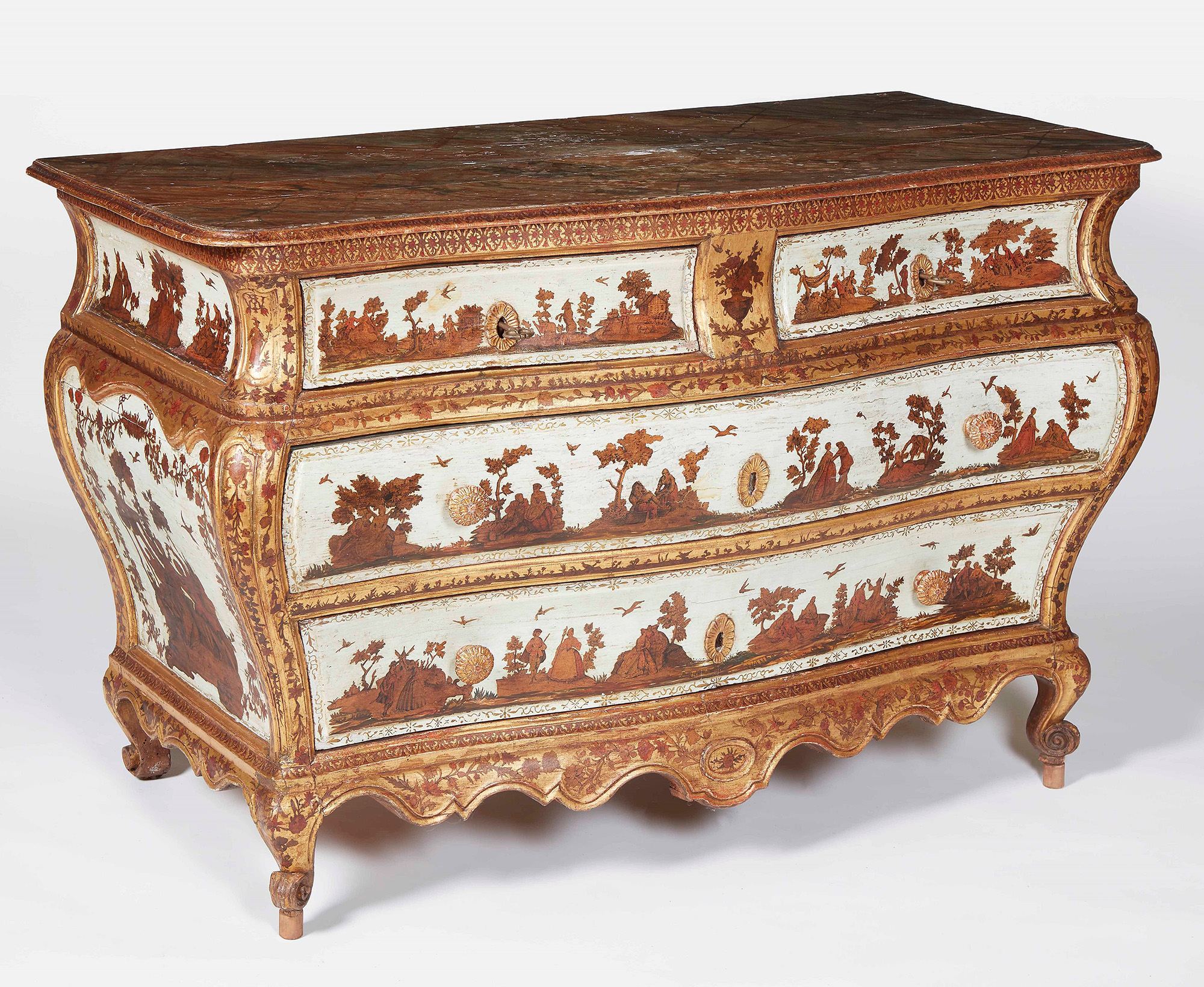 Importante commode di forma bombata in legno laccato, decorato ad "arte povera" e parzialmente dorato. Francia XVIII secolo Fondo laccato e impreziosito da scene galanti e scene di genere. Fronte a due cassetti in linea su due più grandi, grembiale sagomato, gambe mosse terminanti a ricciolo, piano laccato a finto marmo, W. 130 - D. 64 - H. 83 cm, Gotha 1998, Parma, Presenta una decorazione ad “arte povera”, una tecnica veneziana, in gran voga nel Settecento, a imitazione della laccatura ma più sbrigativa, meno pregiata e meno laboriosa della decorazione a lacca. Consisteva nell’applicare sulla superficie lignea, trattata con un fondo a lacca, figure ritagliate da incisioni. Le figure erano poi ritoccate e protette da diversi strati di sandracca, una resina trasparente, fino ad annullare lo spessore della carta e ottenere una superficie levigata e lucida. , Sono le scene galanti a decorare il mobile in oggetto, già ricco nel disegno fortemente sagomato.