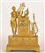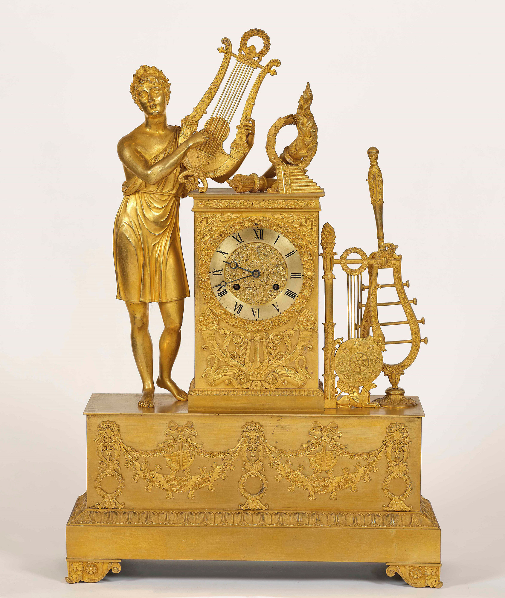 Pendola da camino in bronzo dorato. Francia XIX secolo con figura di Apollo Citreo innanzi a un altare con strumenti musicali e fuoco sacro, cm 41x13x60,5