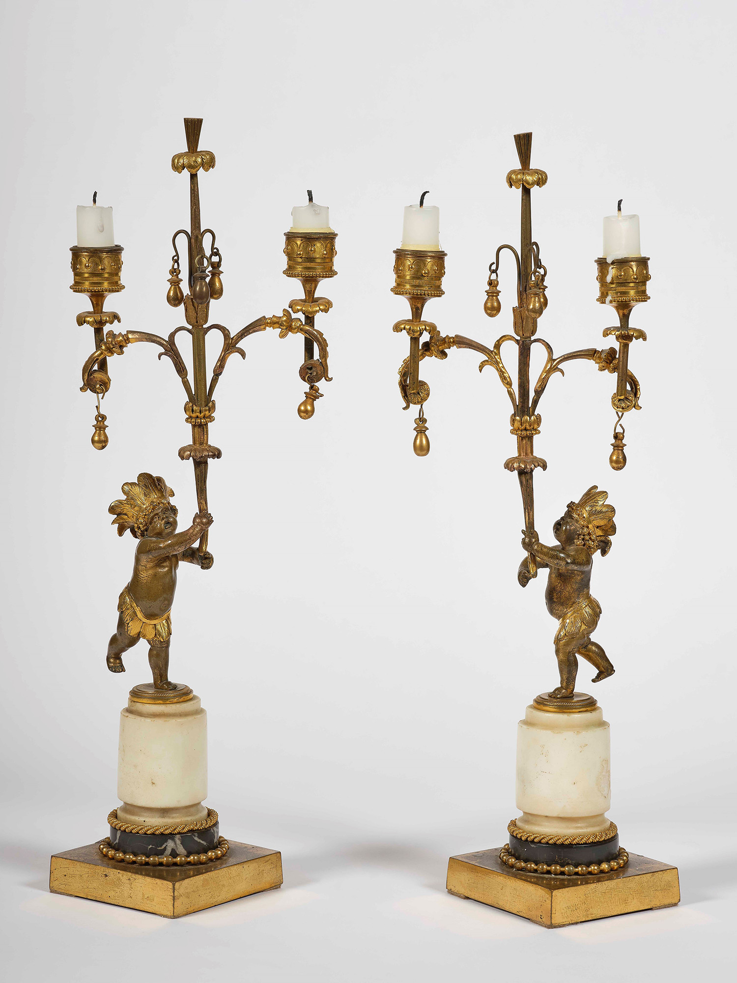 Coppia di candelabri a due fiamme in bronzo dorato e patinato. Francia, XIX secolo Raffiguranti due bambini indiani con corona di piume montati su base cilindrica in marmo bianco e nero, H. 44 cm, Piva & C. srl, Milano