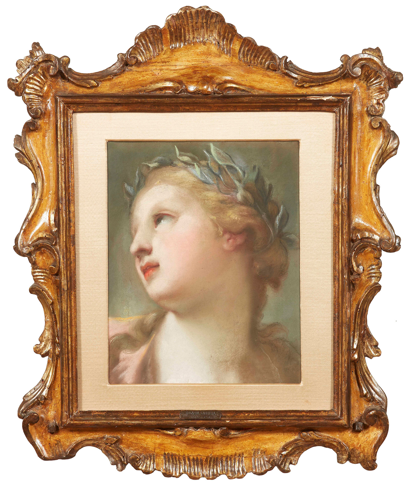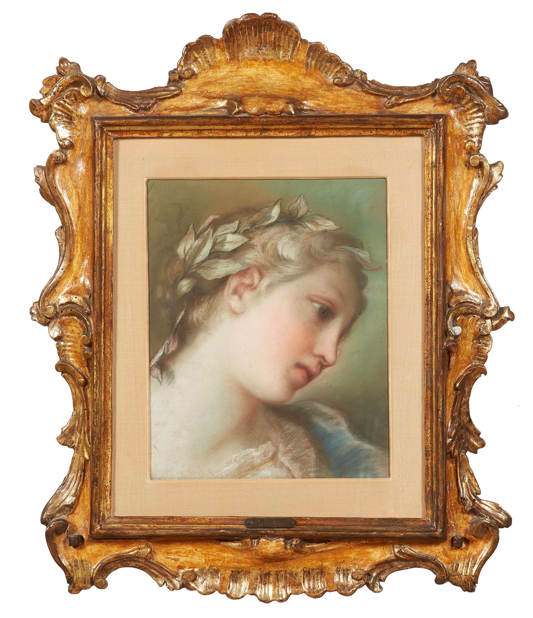 Rosalba Carriera (1673 Venezia-1757 Venezia), Ritratti di muse due, in cornici veneziane coeve del XVIII secolo in legno laccato e intagliato, pastelli su carta, W. 320 - H. 380 mm, Dott. Rodolfo Palucchini (15/11/1973), Le due teste di fanciulle coronate di alloro, qui presentate, risultano essere opere ispirate a un ciclo più ampio di ritratti di Muse realizzati da Rosalba Carriera. Una delle nostre due muse, infatti, riprende perfettamente la composizione del pastello originale conservato presso il museo di Dresda e pubblicato all'interno della monografia dedicata all'artista e pubblicata dalla Prof.ssa Bernardina Sani (foto nr. 200, scheda nr. 229).