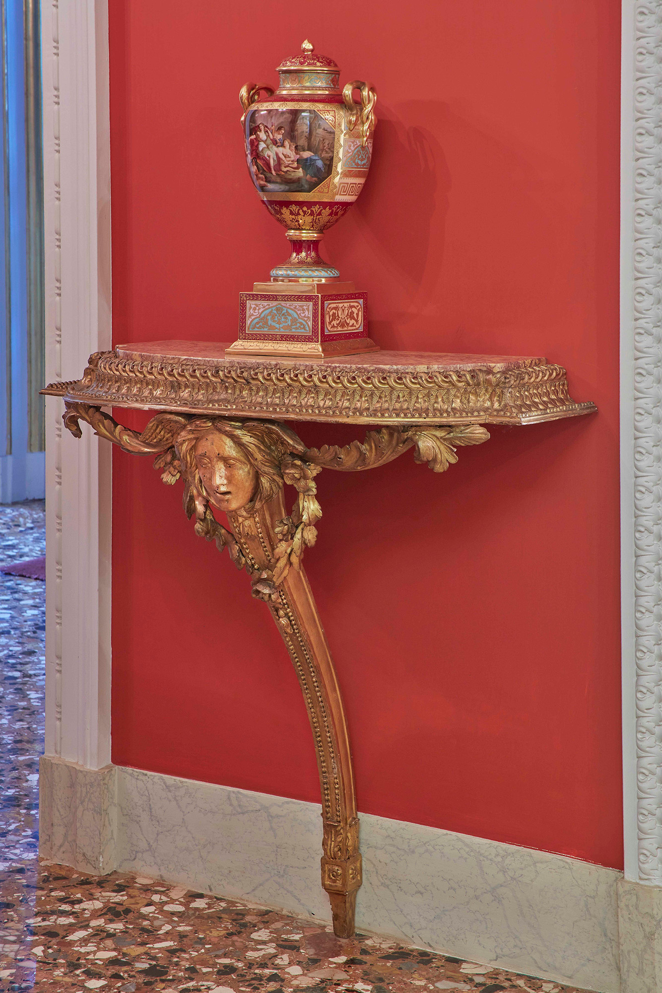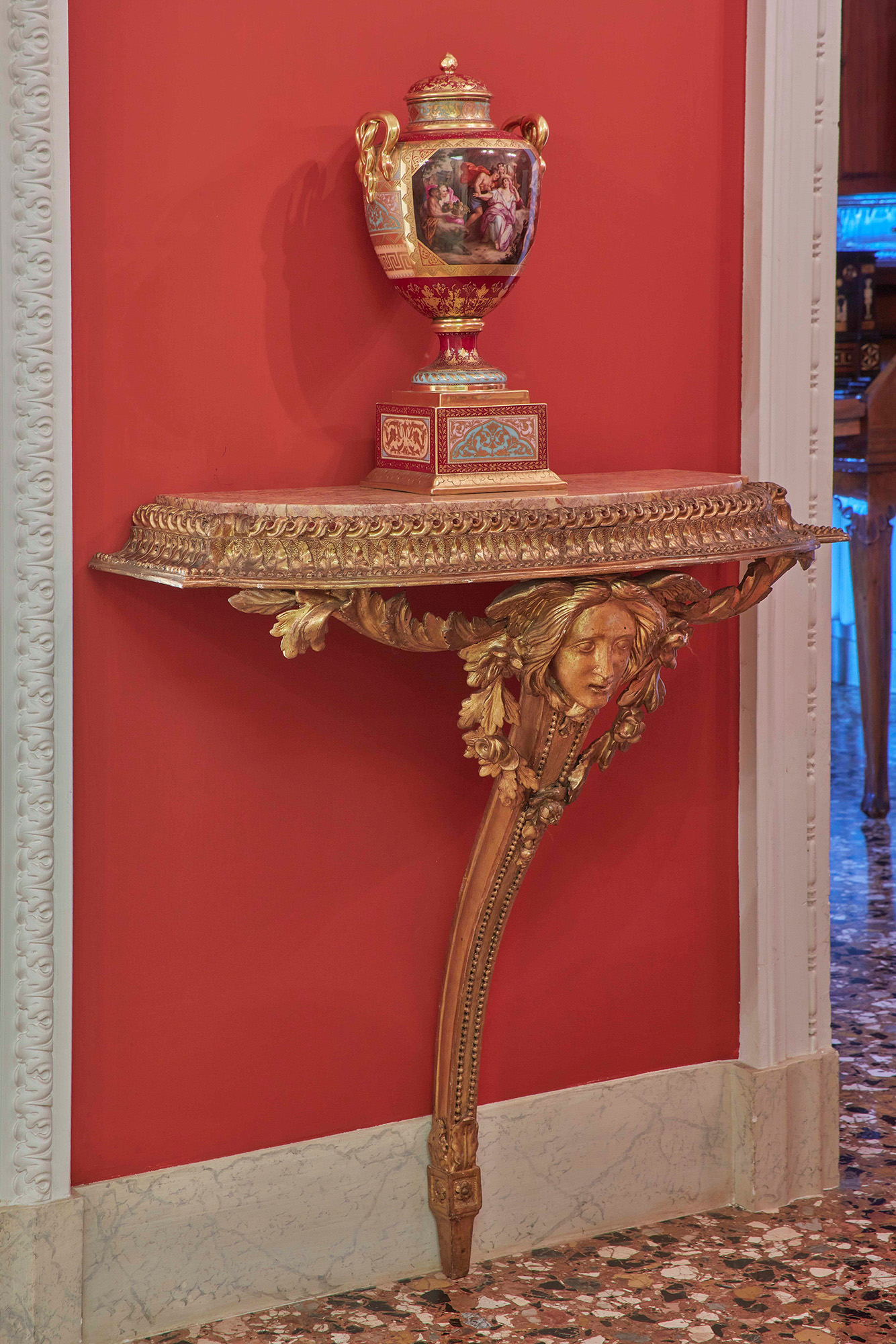 Coppia di consolles a mensola in legno scolpito e dorato. Genova fine XVIII secolo Fascia riccamente intagliata a motivo concatenato e foglie d'alloro. Gamba centrale scolpita all'attacco a mascherone tra volute di foglie e fiori. Piano sagomato in marmo, W. 73 - D. 32 - H. 81 cm, Manuel Longo, Milano