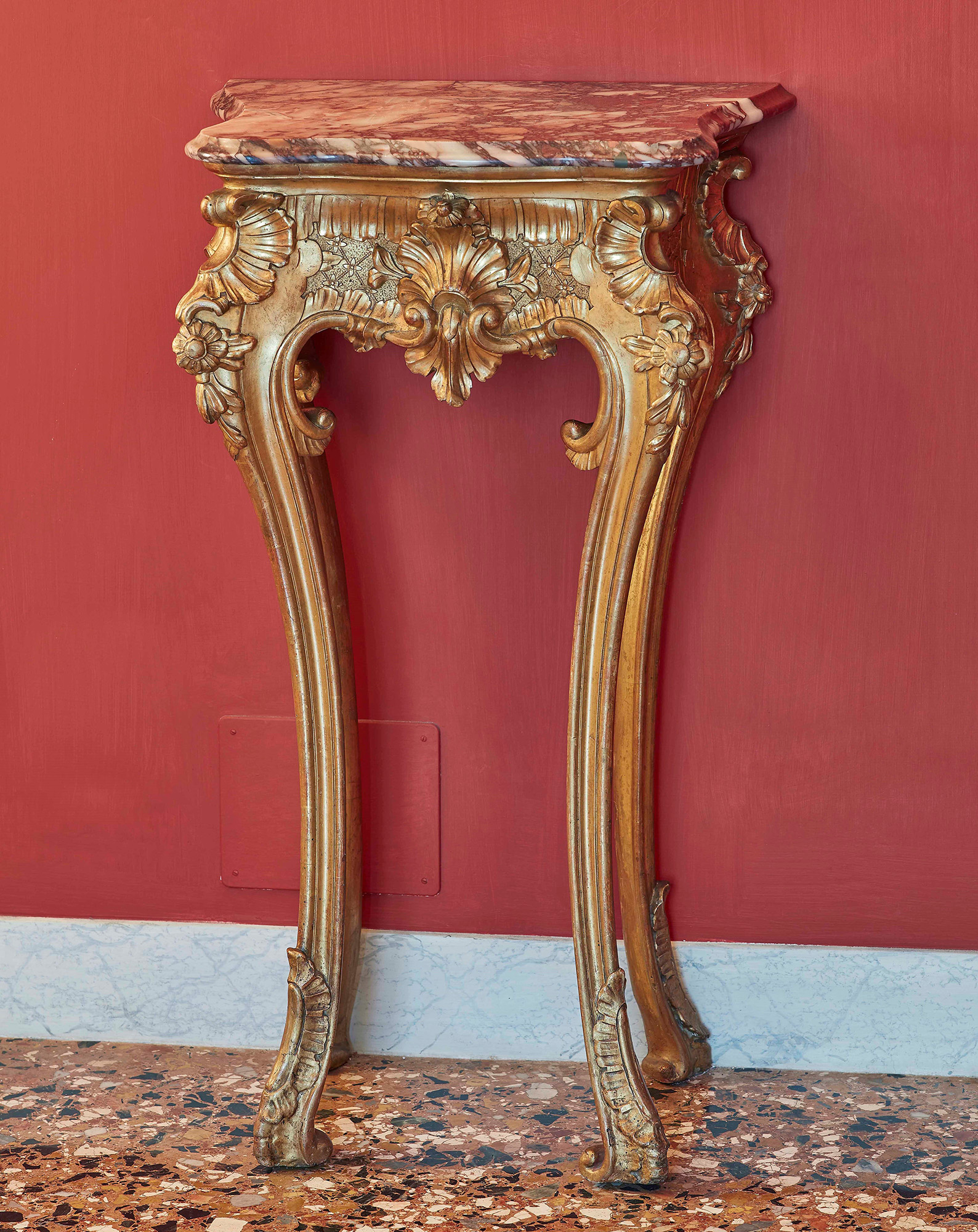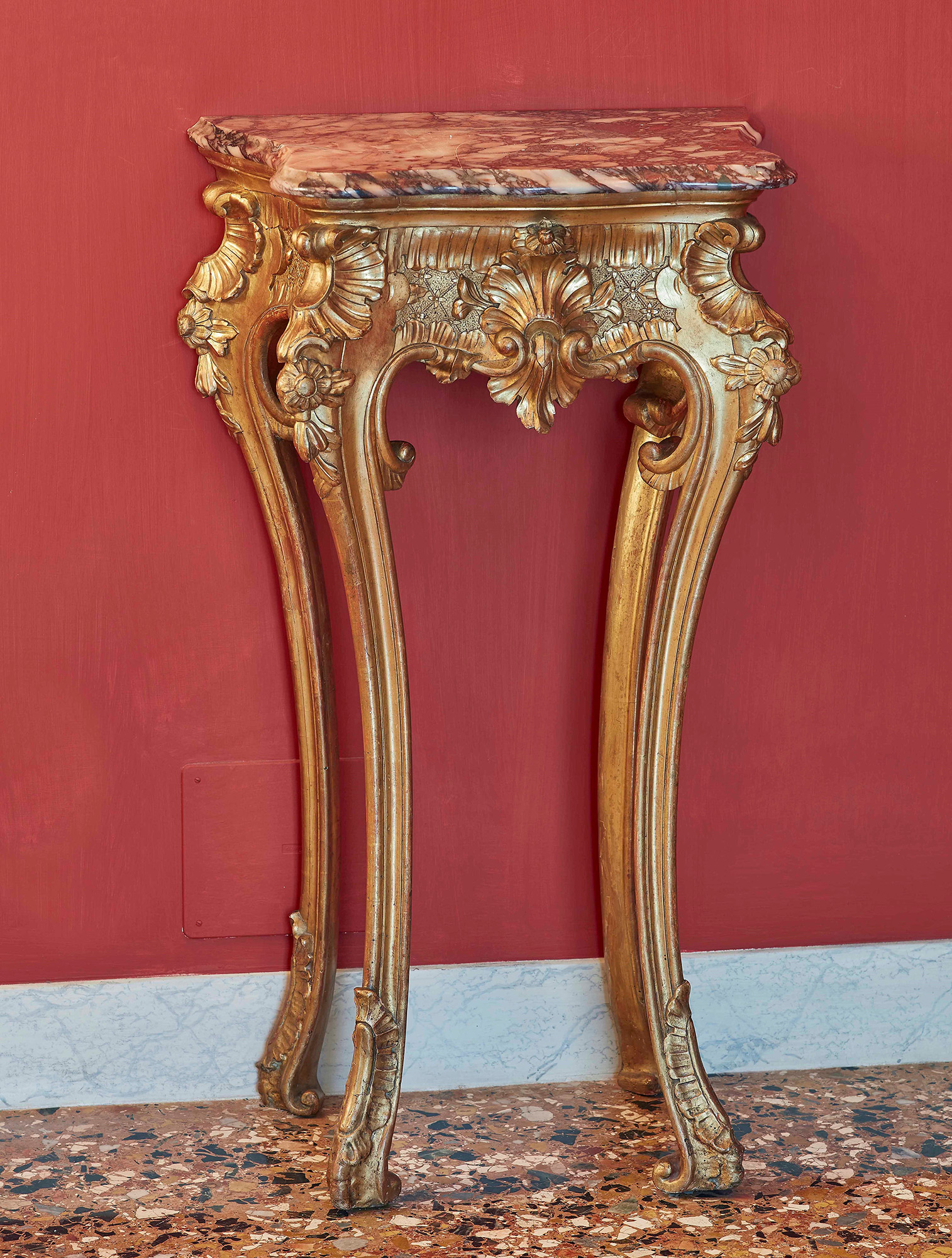 Coppia di piccole consolles in legno intagliato e dorato. Napoli XVIII secolo Fascia sagomata e intagliata a motivi floreali, volute e conchiglie, gambe mosse, piano sagomato in marmo fior di pesco, cm 55x38x92, Il Ponte Casa d'Aste, Milano