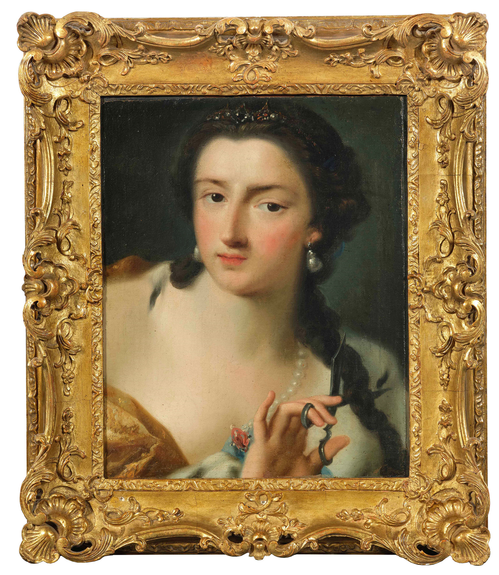 Rosalba Carriera (1673 Venezia-1757 Venezia), Ritratto della Contessa Orzelska in veste di Berenice in cornice dorata, olio su tela, W. 34 - H. 42 cm, Prof. Maurizio Marini, Un esame approfondito della produzione ritrattistica di Rosalba Carriera ha permesso di identificare la donna raffigurata nel dipinto qui presentato con la contessa Anna di Holstein Orzelska. Ritratta almeno altre tre volte dall'artista, la contessa, moglie del duca Carlo Ludovico di Holstein Beck, fu un personaggio di spicco all'interno della corte del principe Federico Cristiano di Sassonia e soggiornò probabilmente di frequente in Italia a seguito della corte., "(...) L'indubbio fascino della contessa deve aver indotto la Carriera a conferirle nella redazione in oggetto, secondo una prassi tipicamente 'rocaille', un emblematico senso allegorico-letterario classicistico. Vale a dire che l'iconografia corrisponde a quella descritta dal letterato alessandrino Theophraso, il quale ricorda, appunto, la vicenda di Berenice: moglie di Tolomeo Evergete, re d'Egitto, la quale, in ossequio a un voto, offrì a Venere i suoi capelli di eccezionale bellezza. (...) La contessa, rivestita dell'ermellino reale, allude al ruolo della mitica regina e, nel mentre si accinge a recidersi la capigliatura, ostenta una parure in cui dominano le perle, emblema marino e sacre a Venere. , Non saprei dire se la contessa volesse alludere a qualche suo voto amoroso, resta, tuttavia, esplicito il messaggio colto e letterario che l'immagine intende suggerire."