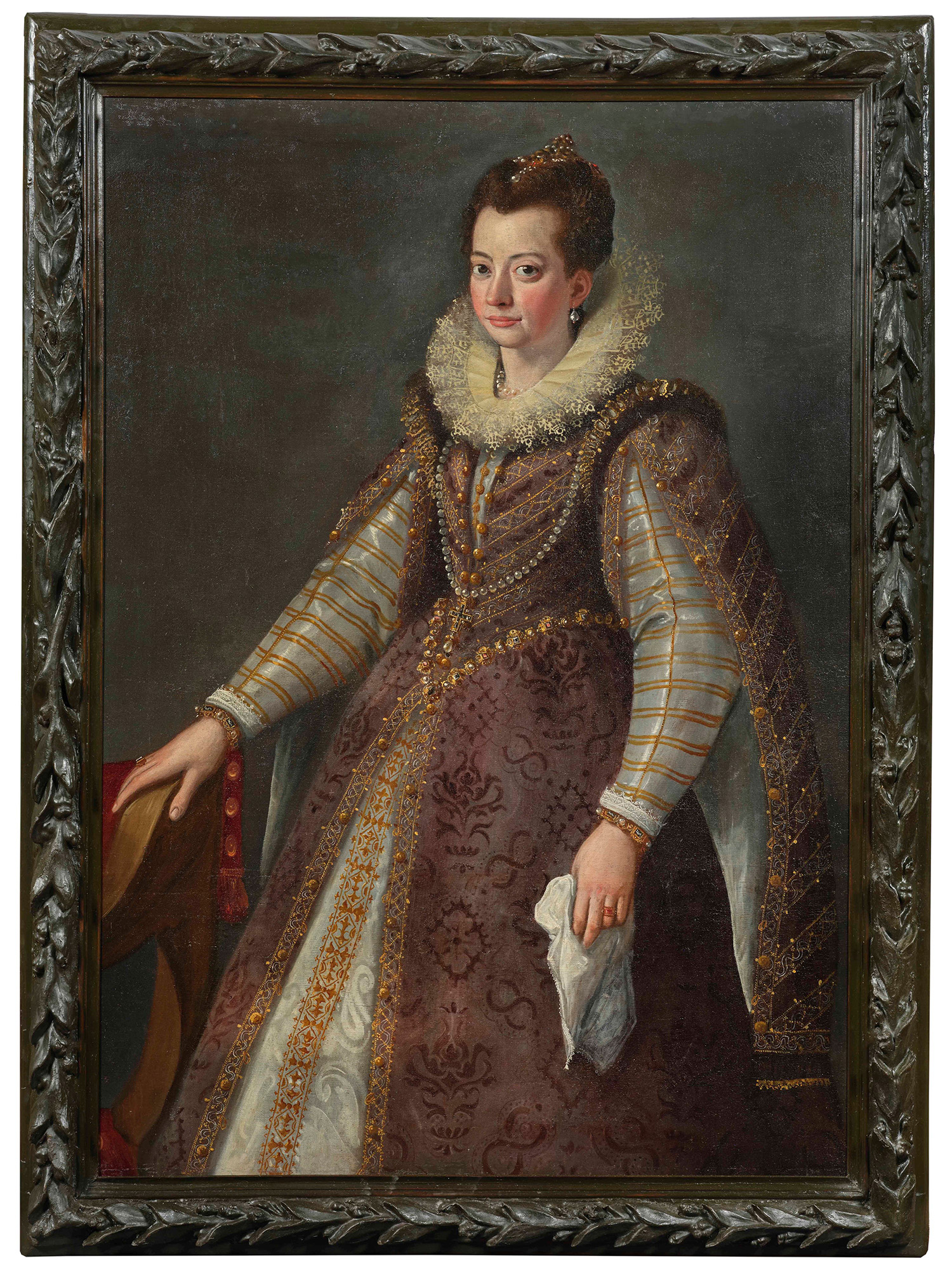 Santi di Tito (1536 Sansepolcro-1603 Firenze), Ritratto di nobildonna in cornice in legno intagliato, olio su tela, W. 90 - H. 130 cm, Prof. Sandro Bellesi, Prima dell'intervento di restauro che ha portato alla foderatura dell'opera, al retro del dipinto, come testimonia la scheda redatta dal Prof. Sandro Bellesi, era presente un'iscrizione che riportava il nome del pittore Santi di Tito e la data "1591"., "(...) Seppur il nome di Santi di Tito si leghi essenzialmente alla realizzazione di immagini sacre, il catalogo di questi raccoglie anche un numero abbastanza rilevante di ritratti, ovvero pregevoli effigi di personaggi appartenenti al patriziato toscano. , (...) Interessante acquisizione al catalogo ritrattistico di santi di Tito, l'opera, finora inedita, mostra come altre effigi muliebri realizzate dallo stesso una cultura artistica ricca di raffinato eclettismo nella quale convivono, armoniosamente, affinità con il linguaggio fiorentino di pittori di ascendenza bronziniana come Alessandro Allori e richiami al mondo romano di fine Cinquecento. (...)"