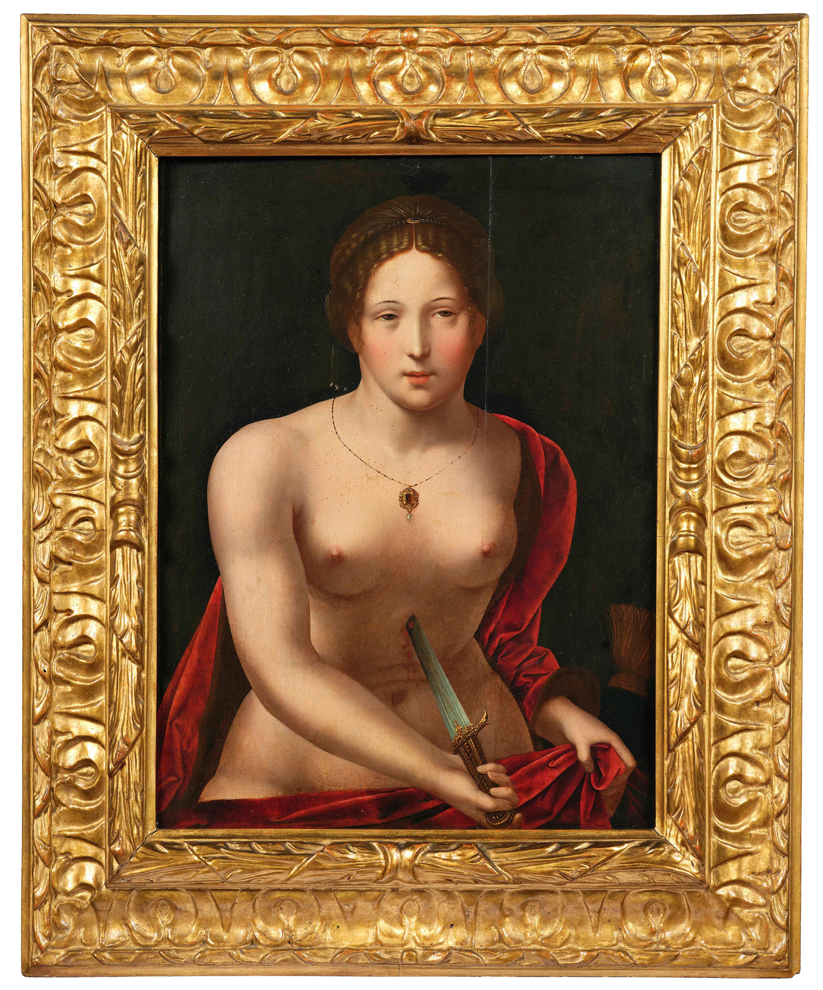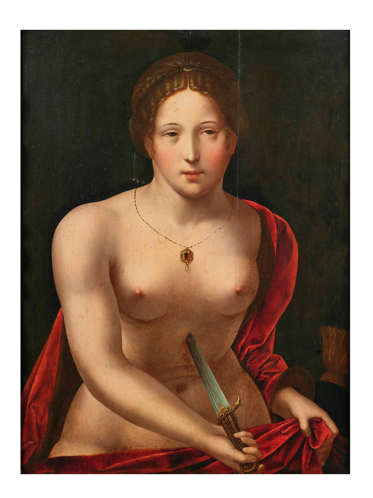 Maestro delle Mezze Figure Femminili (attivo in Olanda nel XVI secolo), Suicidio di Lucrezia in cornice dorata, olio su tavola, W. 40,5 - H. 54 cm, Sotheby's, Londra, dicembre 1987, lotto n. 252, Pittore dall'identità non ancora stabilita, la biografia del Maestro della Mezze Figure Femminili risulta ancora avvolta dal mistero. Pittore attivo in Olanda tra il 1525 e il 1550, deve l'appellativo con cui è conosciuto ai numerosi dipinti raffiguranti mezze figure femminili che gli vengono tradizionalmente attribuiti., Oltre a fanciulle intente a leggere o a suonare uno strumento e figure di sante ritratte nel peculiare scorcio a mezzo busto, un soggetto ricorrente all’interno della produzione del Maestro delle Mezze Figure Femminili è, come nel caso del nostro dipinto, il suicidio di Lucrezia., Ritraendo la donna nell’atto estremo di trafiggersi il ventre con un pugnale, coperta solo da un drappo rosso che le cinge i fianchi, l’artista dà vita a una raffigurazione fortemente drammatica ma, al contempo, sensuale., Importante protagonista della storia di Roma, la figura di Lucrezia è da legarsi, secondo la leggenda, direttamente alla nascita della Repubblica. La decisione della donna di togliersi la vita in seguito alla vergogna dovuta allo stupro subito dal figlio dell’allora imperatore, Sesto Tarquinio, infatti, fu il tragico evento che diede avvio a una sommossa popolare che portò alla cacciata dei Tarquini da Roma e all’istituzione della Res Publica.