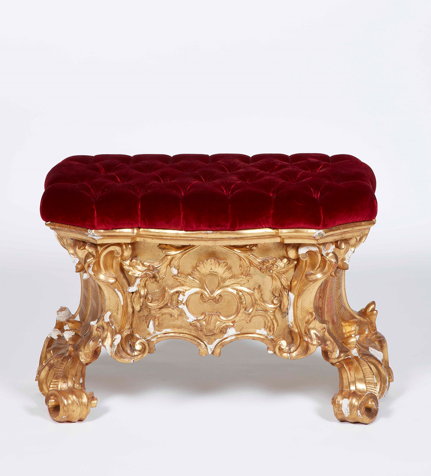 Sgabello in legno intagliato e interamente dorato. XVIII secolo Seduta imbottita e rivestita in tessuto rosso, W. 80 - D. 43 - H. 56 cm