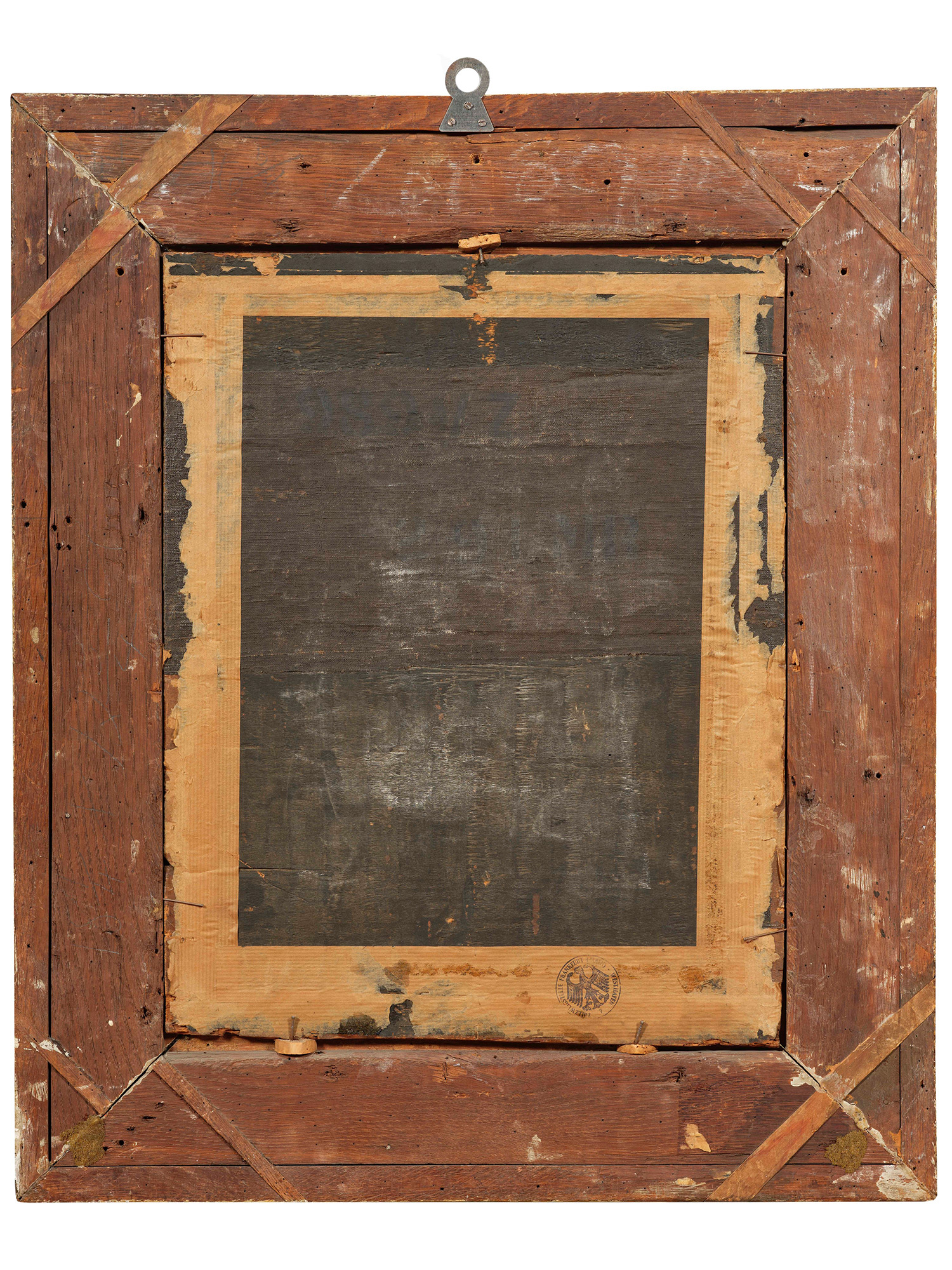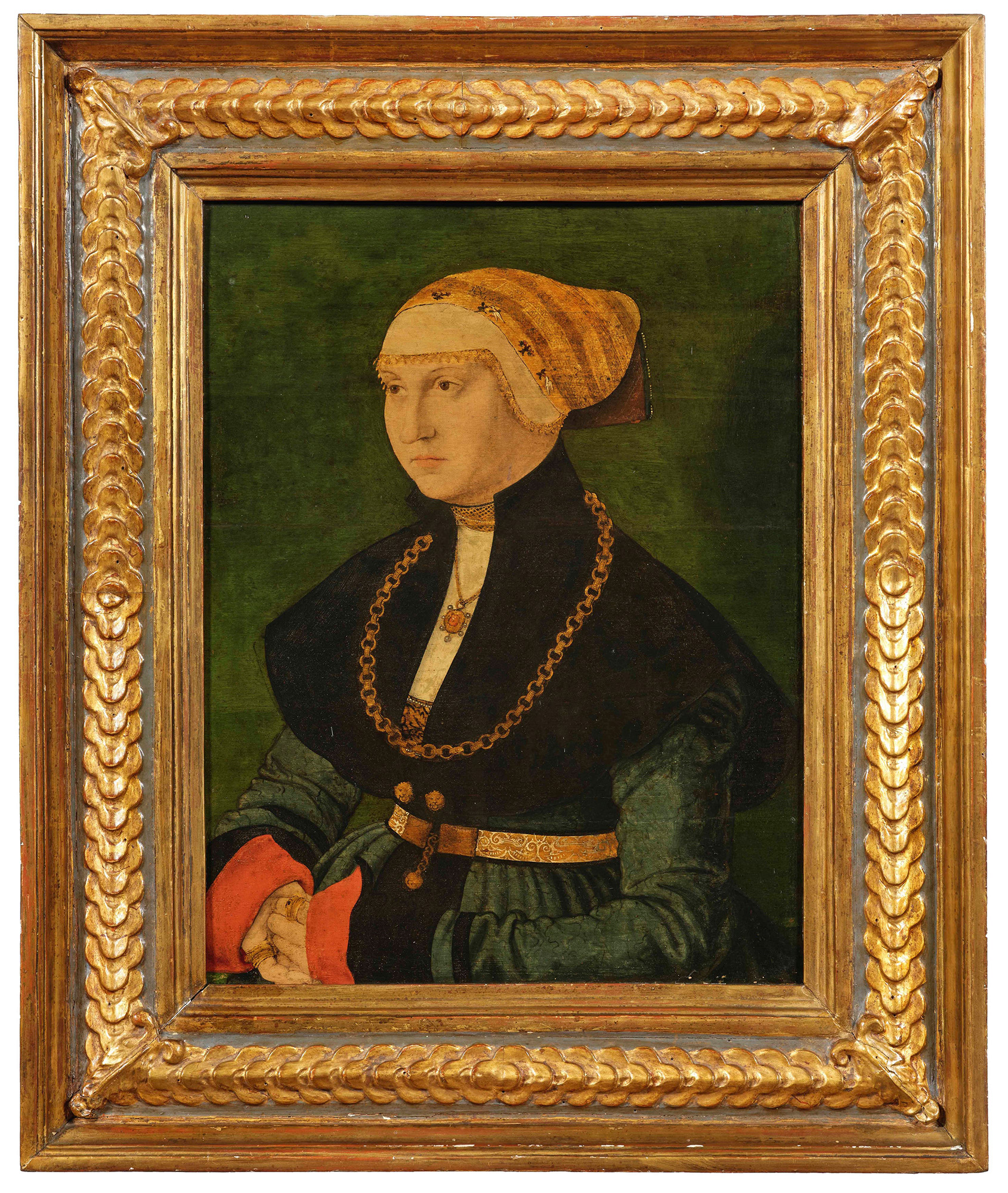 Conrad Faber (1500 ca. Kreuznach -1552/1553 Francoforte), Ritratto di gentildonna in cornice in legno policromo e lumeggiature dorate, Reca al retro timbro di collezione, , olio su tavola, W. 34 - H. 43 cm, Dott. Fritz Heinemann (17/5/1971), Expertise redatto da uno studioso tedesco ma dalla firma poco leggibile (25/2/1962), Bibliografia di riferimento: W. Brücker, Conrad Faber von Creuznach, Frankfurt am Main, 1963, L’opera qui presentata è tradizionalmente ricondotta alla mano dell’artista Conrad Faber, celebre ritrattista attivo nella prima metà del XVI secolo., Raffigurata a mezzo busto, leggermente rivolta a sinistra e posta dinanzi a uno sfondo color verde, la dama ritratta indossa un abito in velluto con una mantellina nera a contrasto, impreziosito in vita da una cintura d’oro. Al collo due collane impreziosiscono il décolleté della dama, celato al di sotto di una camicetta dal colletto intessuto con fili preziosi. Le mani, poste l'una dentro l'altra, sono anch’esse impreziosite da diversi anelli con pietre incastonate. Il volto, reso con grazia e dai lineamenti fini, è rivolto con sguardo attento verso sinistra, con il capo coperto da un cappuccio color oro impreziosito da fini ricami., Nonostante l’identità della dama ritratta sia ancor oggi sconosciuta, le ricche vesti e i monili preziosi la identificano certamente come un esponente dell’aristocrazia di Francoforte, presso la quale Conrad Faber fu attivo come ritrattista per la gran parte della sua vita.