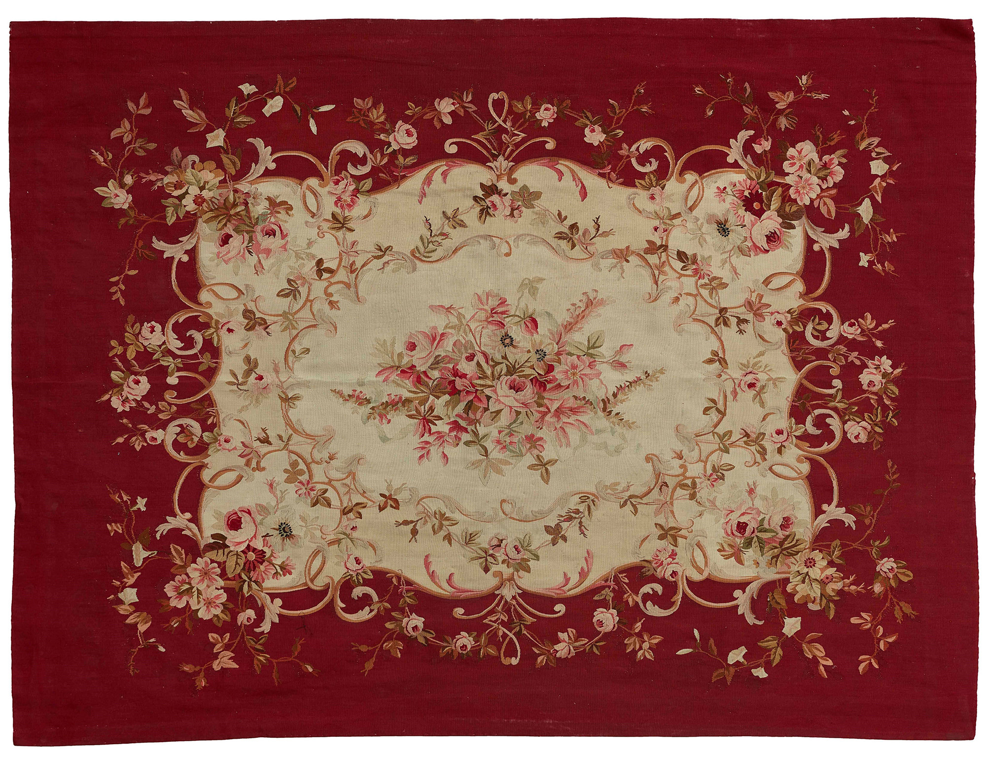 Aubusson Francia fine XIX secolo fondo bordeaux con bouquet centrale e tralci di rose su campo avorio, W. 200 - D. 150 cm, Azizian, Milano