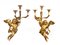 Coppia di appliques in legno intagliato e dorato a tre fiamme. XVIII-XIX secolo Con figure di putti alati nell'atto di reggere i tre bracci, H. 50 cm