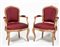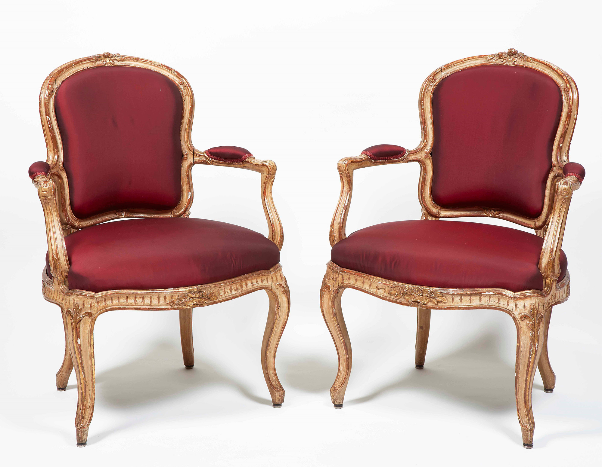 Coppia di poltrone in legno intagliato, laccato e parzialmente dorato. Francia XVIII secolo Braccioli mossi, gambe arcuate, fascia e schienale centrati da decoro floreale intagliato, W. 84 - D. 50 - H. 90 cm, Arte Antica s.r.l. Napoli